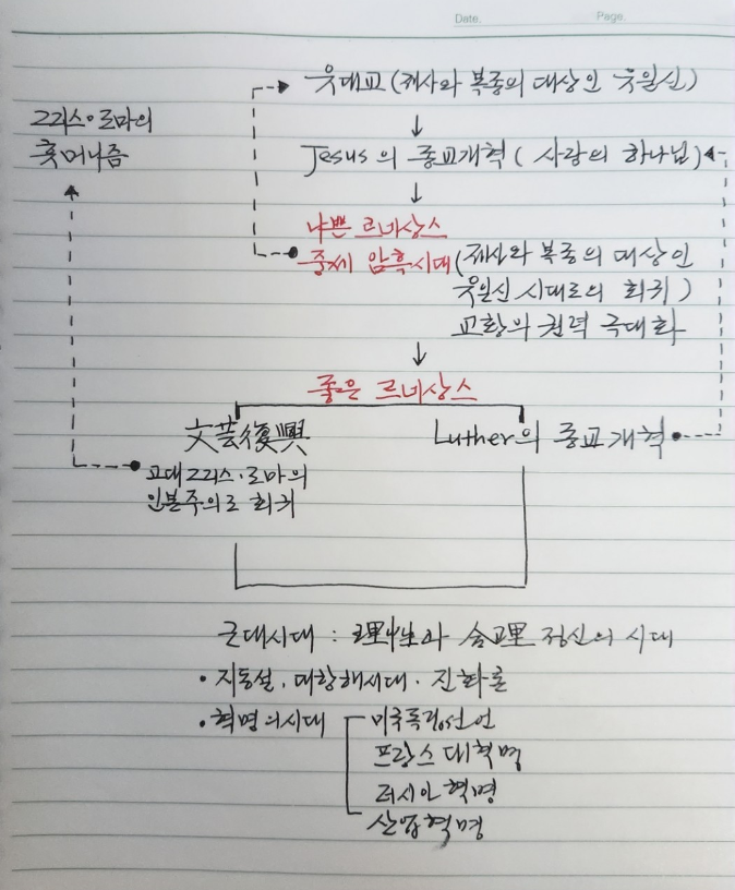르네상스는 정신문화의 암흑기로 치부되던 서양 중세기의 감옥에서 인간성이 해방된 때입니다. 476년 로마제국의 멸망으로 로마제국 영토가 쪼개지면서 지역 간 나라 간의 분열과 분쟁으로 구심적 역할을 하는 어른이 필요했습니다. 정신적 지주랄까요. 교황과 기독교의 절대적 영향력으로 유럽사회는 성서와 기독교 율법과 종교의식이 모든 것에 우선하였고 왕들도 가장 두려운 것이 교황으로부터 기독교 울타리 안에서 쫓겨나 파문당하는 것이었습니다. 신성로마제국 황제 하인리히 4세는 성직자 임명권을 두고 교황그레고리 7세와 대립하다가 교황으로부터 파문을 당했습니다. 그는 교황이 있는 카놋사 성 밖 눈 밭에서 사흘을 무릎 꿇고 빌고 나서야 용서를 받았습니다. '교황은 반짝이는 태양이며, 황제는 그 빛을 받아 겨우 빛을 내는 달과 같다.'라고 말하는 시대가 바로 중세시대였습니다.