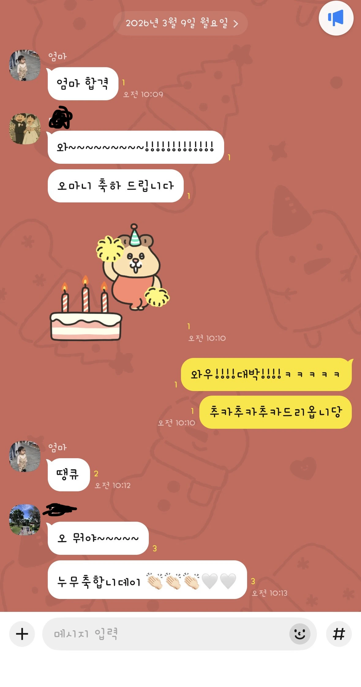 지난주 금요일 그동안 공부했던 요양보호사 시험을 치르는 엄마를 위해 온 가족이 톡방에서 응원의 메시지를 보냈습니다. 시험을 보고 나신 엄마는 힘이 없었습니다.