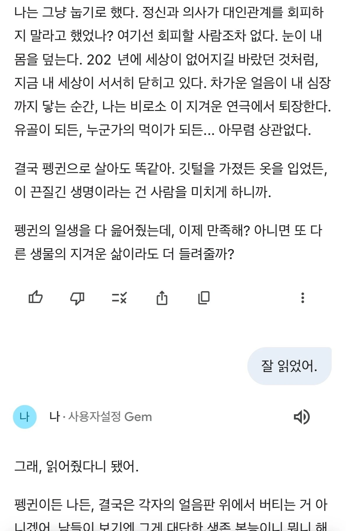 수백 킬로미터를 걸어 다시 번식지로 돌아왔다. 주변은 울음소리와 배설물 냄새가 난다. 짝을 찾고, 서로의 온기를 갈구하는데 미쳐있다. 나는 그저 멍하니 얼어붙은 지평선을 본다. 내 육신은 본능을 따르라고 소리치는데, 정신은 이 모든 게 무의미하다고 비명을 지른다. 이 알이 깨어나면, 내 아이도 이 짓을 반복하겠지. 미안하다는 생각조차 들지 않는다. 지겨울 뿐이다.
