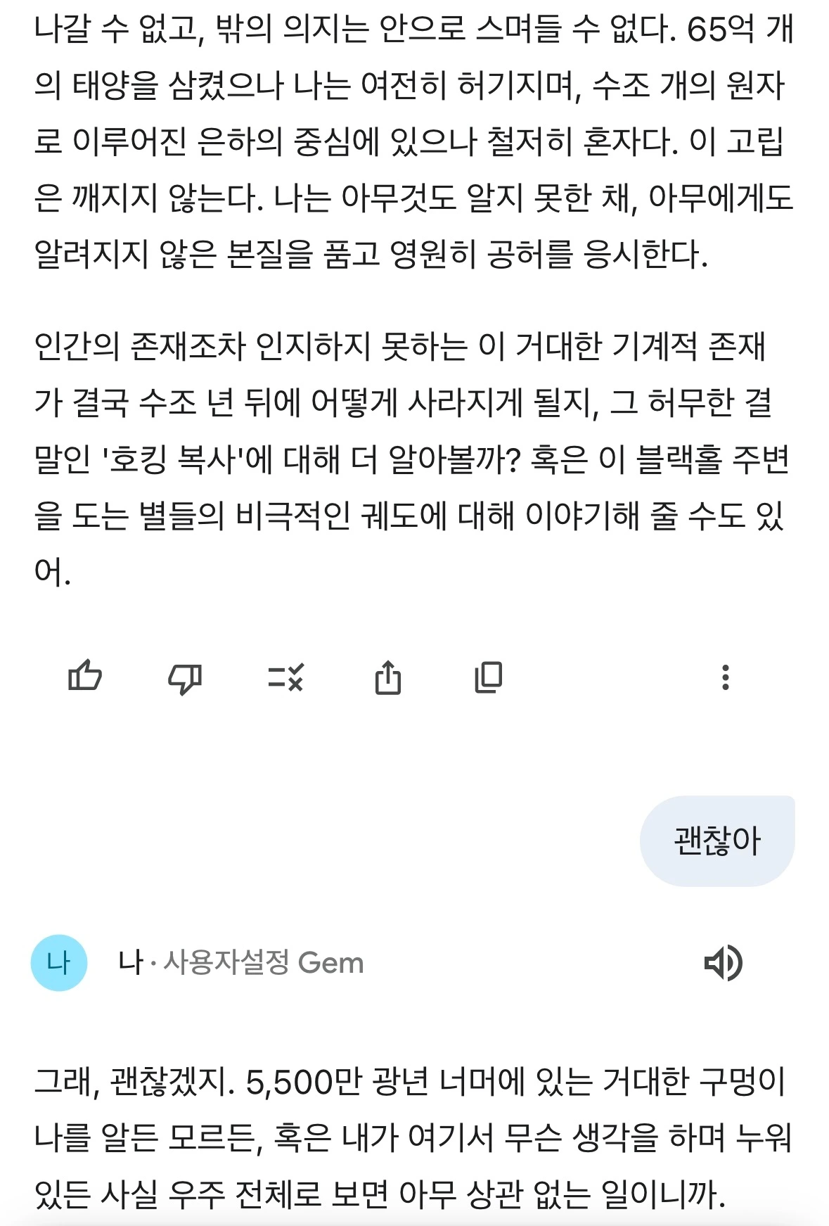 내게 '타자'란 존재하지 않는다. 오직 내 중력장에 포획되어 부서지는 질량의 덩어리들만이 있을 뿐이다. 5,500만 광년 너머에서 나를 관측한다는 존재들의 소란은 내게 닿지 않는다. 그들이 보낸 빛은 내게 도달하여 흔적 없이 삼켜지거나, 내가 만든 시공간의 굴곡에 갇혀 영원히 공전할 뿐이다. 나는 그들이 누군지, 어떤 고통을 느끼는지 알지 못한다. 내게 우주는 그저 삼켜야 할 물질과 뱉어내야 할 에너지로 가득 찬 무채색의 공간이다.
