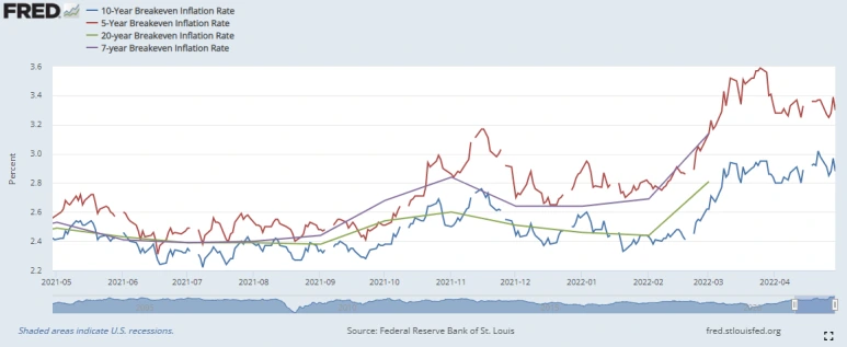 페드금리는 이제 겨우 1회 상승했지만 장기 채권이 이미 미래예측치를 다 반영해버린 것처럼, 인플레이션 역시 현재의 인플레이션은 거의 꺾이지 않았지만 미래로 갈수록 하방압력이 높아진다고 보고 있습니다. 20년, 30년 BREAKEVEN 인플레이션수치는 통계발표가 늦어 아직 나오지 않았지만, 단기 인플레이션이 꺾이고 있으니 그보다 큰 폭으로 꺾여있을 확률이 큽니다. 그러면 2.0~2.4퍼 근처에 머물고 있을 확률이 높다고 판단합니다..