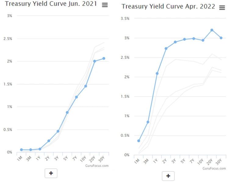 22년4월 현재는 20년물,30년물의 머리가 꺾인상황입니다. 그리고 1분기 GDP는 -1.4포인트를 기록했습니다.