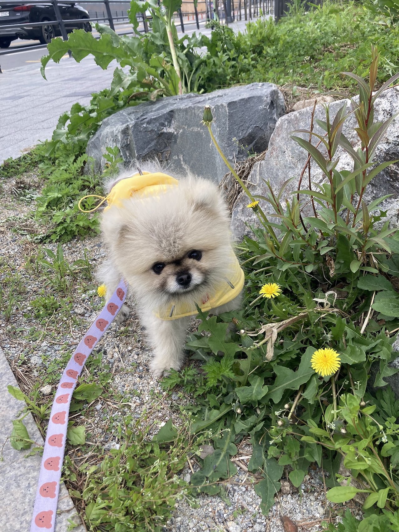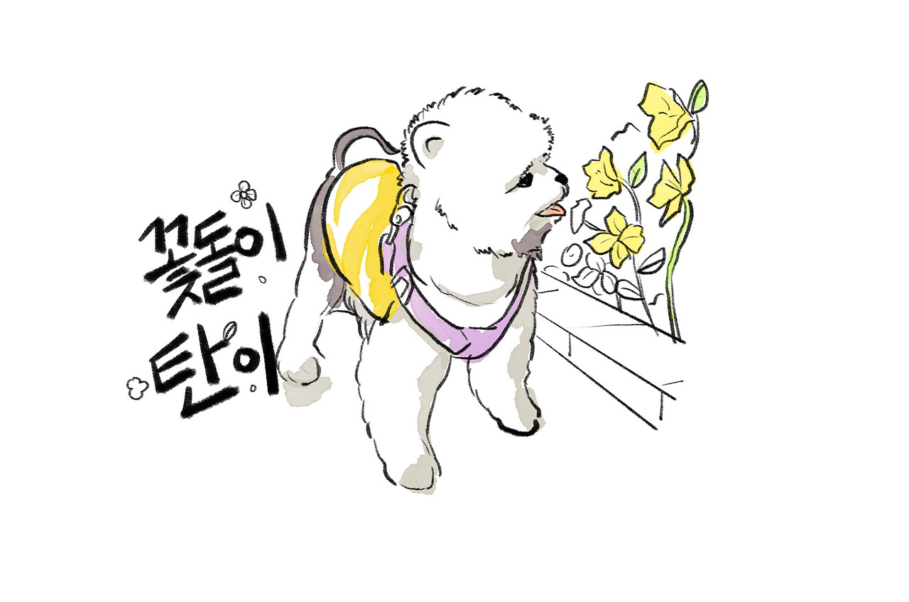노오란 잠바를 입은 탄이가 민들레에 얼굴을 갖다대는데…