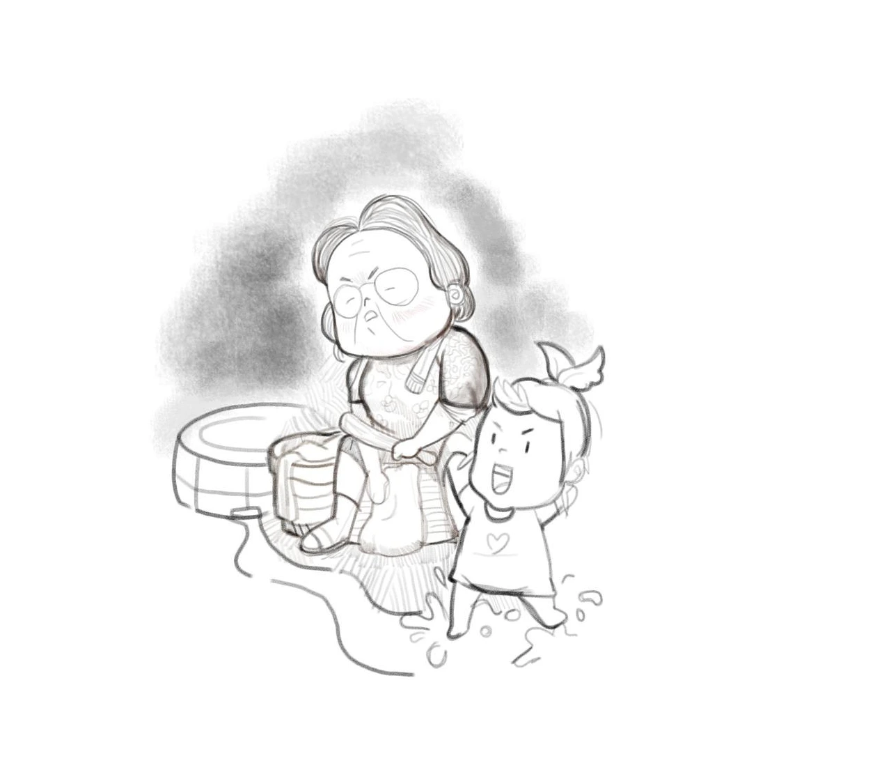 "에미야, 얘 혼내지 마라. 할미 돕겠다고 한 건데."