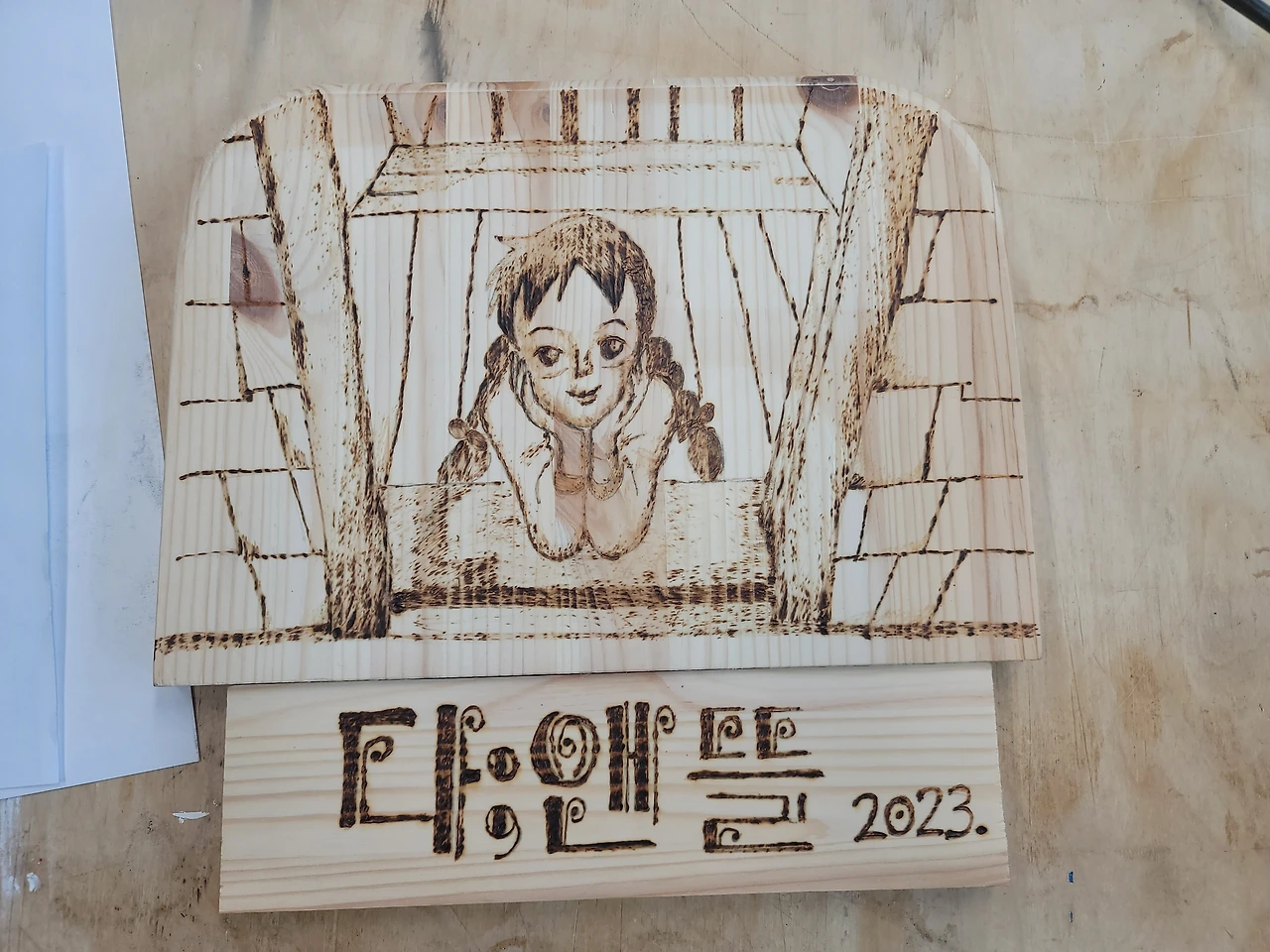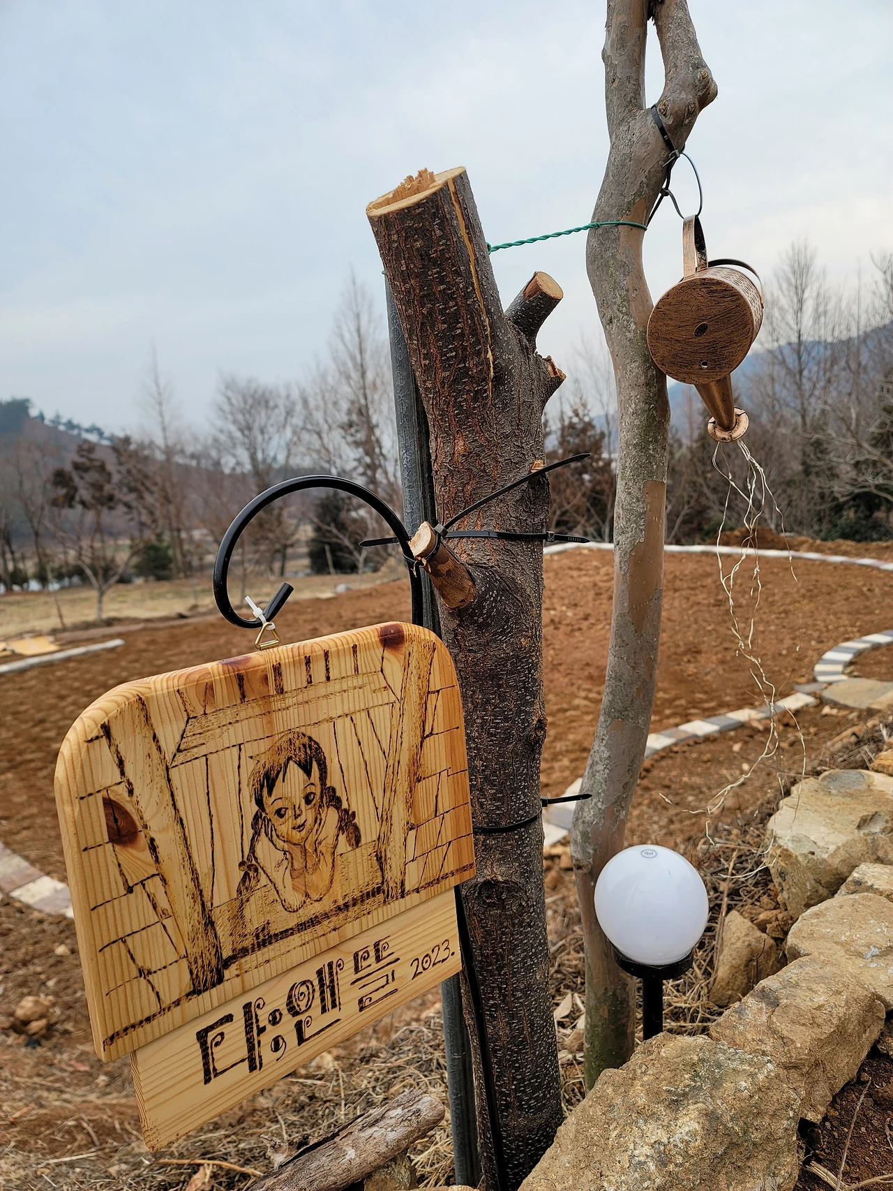 우연히 우드버닝을 해볼 기회가 있어 나무판에 빨강머리 앤 캐릭터를 음영으로 채우고 뜰 이름을 써보았다. 생각했던 것보다 훨씬 더 맘에 든다. 그림에 젬병인 나도 이렇게 뭔가를 완성할 수 있다니, 똥손인 내 손에게 처음으로 격한 고마움이 밀려온다. 내 손도 뭔가를 만들 줄 아는구나. 만든 문패를 공유했더니 모두들 좋다고 한다. 지인들의 오밀조밀한 관심이 내 생의 첫 뜰의 이름을 지어 주었고, 이틀 동안 내 똥손의 노동이 뜰의 문패를 완성했다.