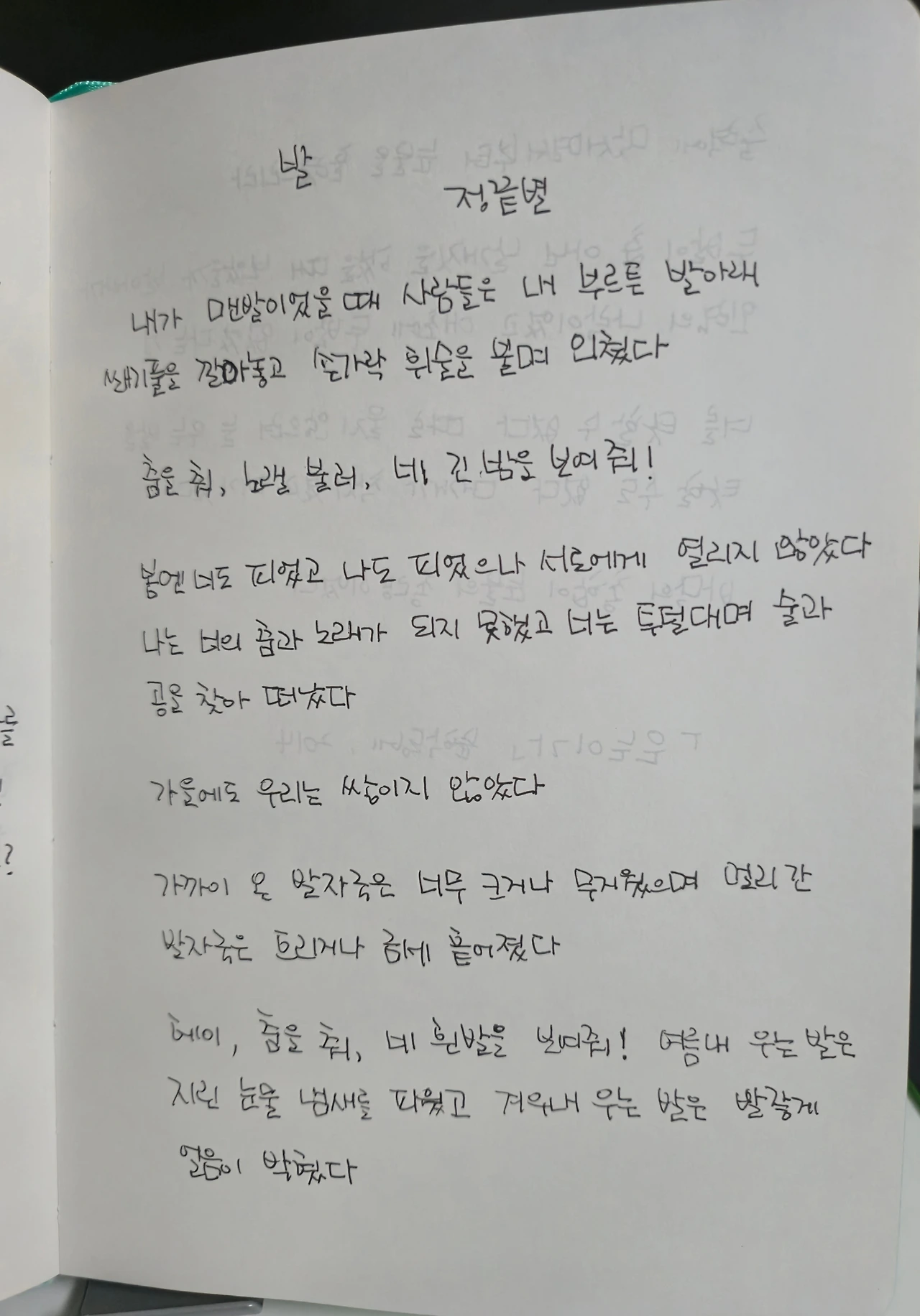 '여름내 우는 발은 지린 눈물 냄새를 피웠고 겨우내 우는 발은 발갛게 얼음이 박혔다'