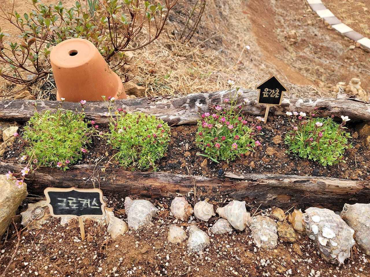 여섯 포트 구입한 한 것 중 세 포트는 나무둥치 화분에 심고 나머지 세 포트는 안쪽 화단 경계에 심는다.