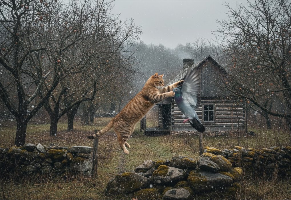 상황은 긴박했다. 산비둘기는 마당의 풀씨를 쪼아대며 바삐 종종거렸고, 바위틈에 완벽히 매복한 고양이는 잔뜩 자세를 낮추어 적당한 공격 기회를 노리는 듯 보였다. 얼마 지나지 않아 분위기가 심상치 않음을 간파한 비둘기가 날개를 펼치고 퍼드득 비상하려는 순간, 고양이는 엄청난 점프력을 발휘하여 공중에 튀어올라 날카로운 발톱을 세운 앞발로 산비둘기의 두부를 강타했다. 맥없이 추락한 비둘기는 거듭된 고양이의 난폭한 공격에 속수무책인 듯 보였고 이내 상황은 종료되었다.
