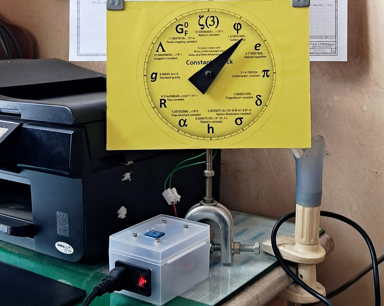 위 사진은 필자가 직접 고안하여 제작한 아날로그 시계로서, 12분에 한번씩 왼쪽 (반시계방향)으로 회전하지만 현재의 시와 분을 정확히 나타낸다. 귀엽게도 하루에 몇 분씩 늦거나 혹은 빠르지만 정전이 되지 않는한 시계가 죽은적은 없다. 징그러운 초침과 분침이 없기에 조급함에서 탈출하기 쉽고, 숫자판 대신 물리 상수를 채용하고 있으므로 우주를 조망하기에 적합하다.