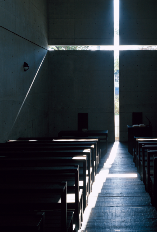 아래 사진은 안도 다다오의 대표작 중 하나인 빛의 교회다. 그의 건축의 특징인 노출 콘크리트와 자연의 일부인 빛을 건물 안으로 들여와 교회에 반드시 필요한 성스러운 분위기를 연출하였다. 그는 교회를 짓고 싶다는 목사님의 의뢰를 받고 빛이 사람들을 모으고 생각하게 만드는 공간을 창조하고 싶었다고 한다.
