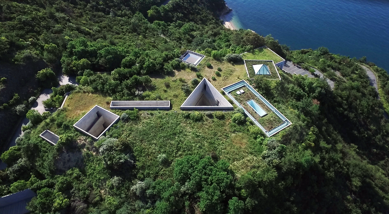 아래 사진은 지중 미술관이다. 이 미술관은 바다 근처에 있다. 그는 건물의 스케치를 하며 많은 요소를 고민하였다. 만약 건물이 언덕 위로 우뚝 솟는다면 아름다운 주변의 풍경을 망치기 때문에 과감하게 미술관을 지하로 넣기로 한다. 그리고 뻥 뚫린 중정을 통해 작품들에 빛이 쏟아지게 하는 것이다. 그가 중요하게 생각하는 자연과 건축물의 조화 그리고 빛의 혁신적인 활용이 잘 나타난 건물이다.