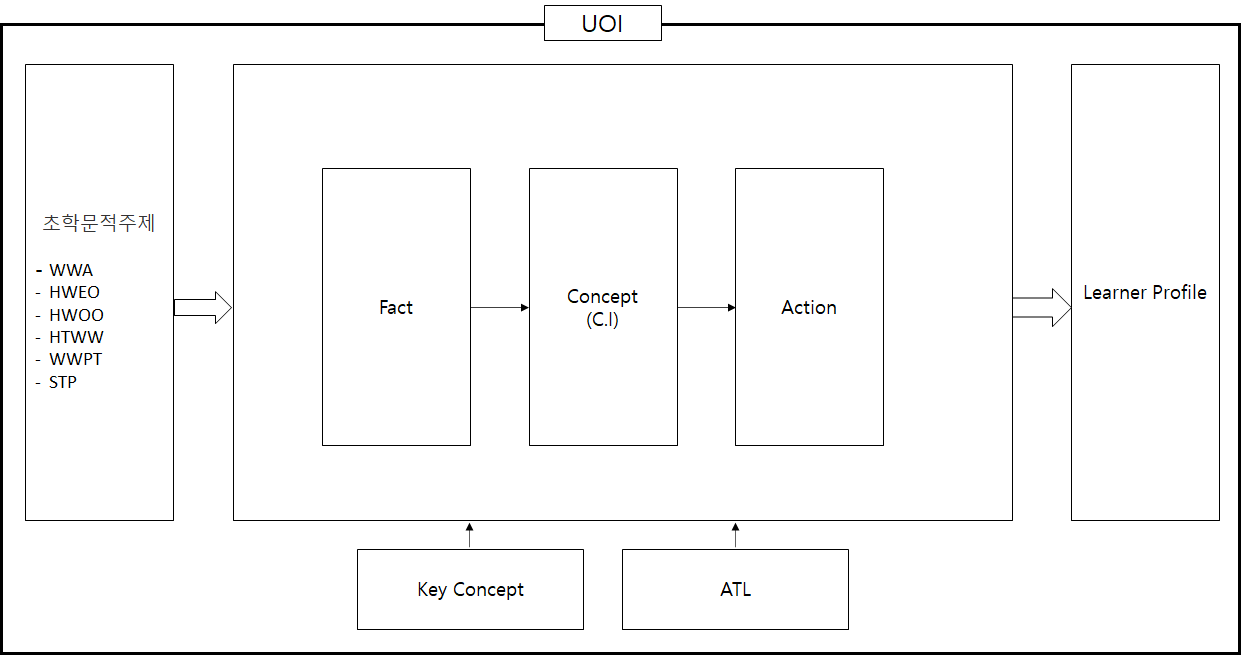 각 초등학교는 IB PYP를 적용하면서 하나의 POI(Programm of Inquiry)를 만들게 되고 POI는 각 학년의 UOI(Unit of Inquiry)들을 통해 구성된다. 각 학년은 매년 6개의 UOI를 진행해야 한다. 즉, 6학년 졸업때까지 총 36개의 UOI를 수행하게 된다.