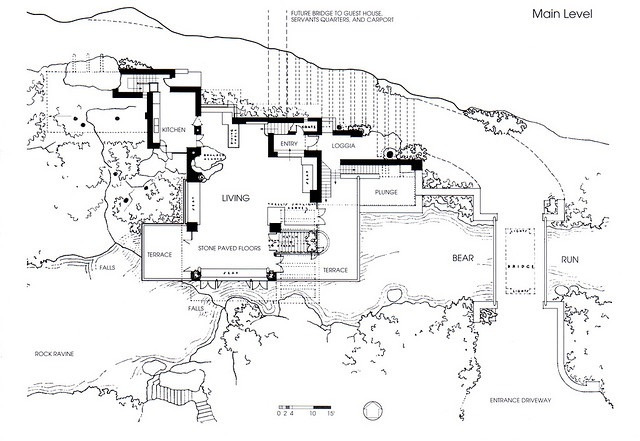 아래 사진은 낙수장의 간략한 설계도이다. 넓은 거실과 방마다 있는 테라스가 눈에 띈다.