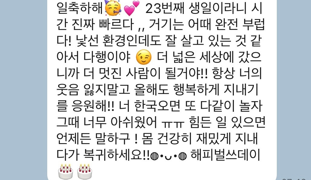 그리고 코토미가 써준 짧은 생일 편지. 이 친구도 한국어, 케이팝, 케이 드라마에 관심이 많은 친구였는데 그래서 그런지 말이 잘 통하고 오래 만난 것처럼 편했다. 일본 가면 연락해야지!