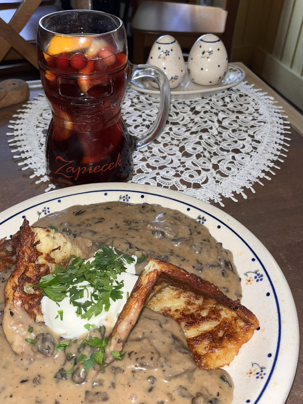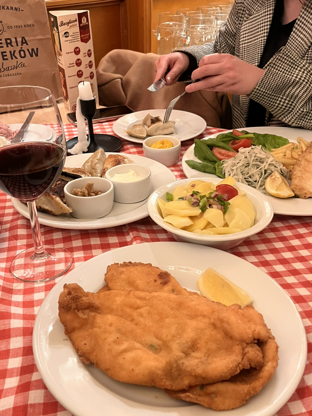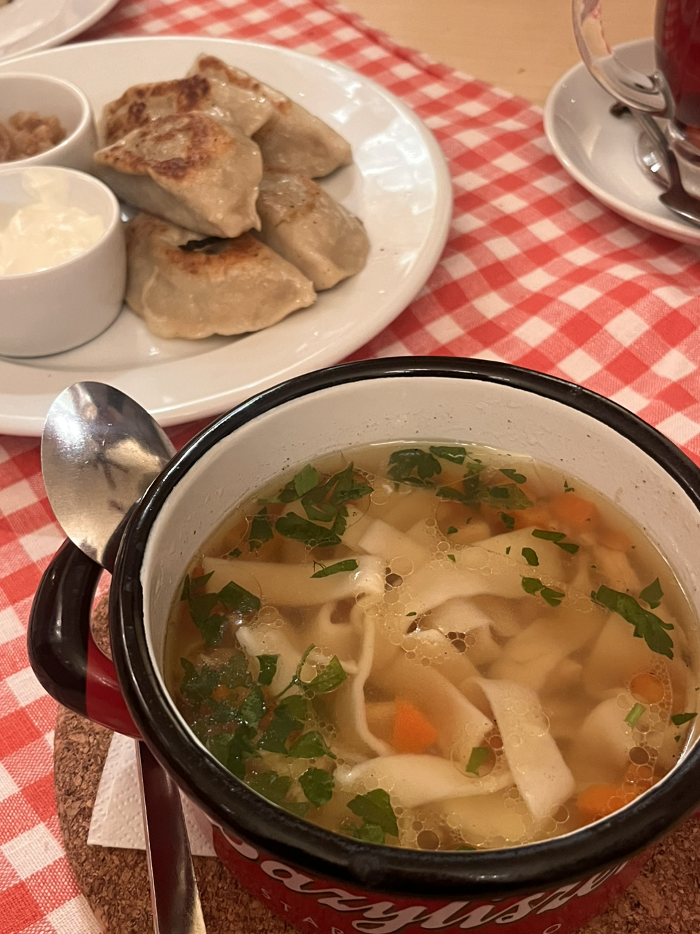 폴란드 친구에게 맛집을 추천해 달라고 했지만, 추천해준 곳이 영 땡기지 않아 혼자 걸어 다니며 비싸 보이는 레스토랑으로 들어갔다. 지갑이 가벼운 학생이기 때문에 여행 중에 대충 먹는 편이지만, 폴란드는 물가도 저렴할 거라 생각해서인지 비싼 식당에 들어가보고싶었다. 폴란드의 음식 피에로기를 먹었는데 안이 오리인가.. 어떤 오리류 고기여서 새롭기도 했지만 내 입맛엔 맞지 않았다. 폴란드 물가가 저렴할 줄 알았지만 역시나 관광지의 레스토랑은 저렴하지만은 않았다. 혼자 스프와 만두 그리고 칵테일 한 잔 해서 3만 원 정도가 나왔다. 그래도 혼자 여유롭게 밖을 바라보며 먹을 수 있어서 좋았다.
