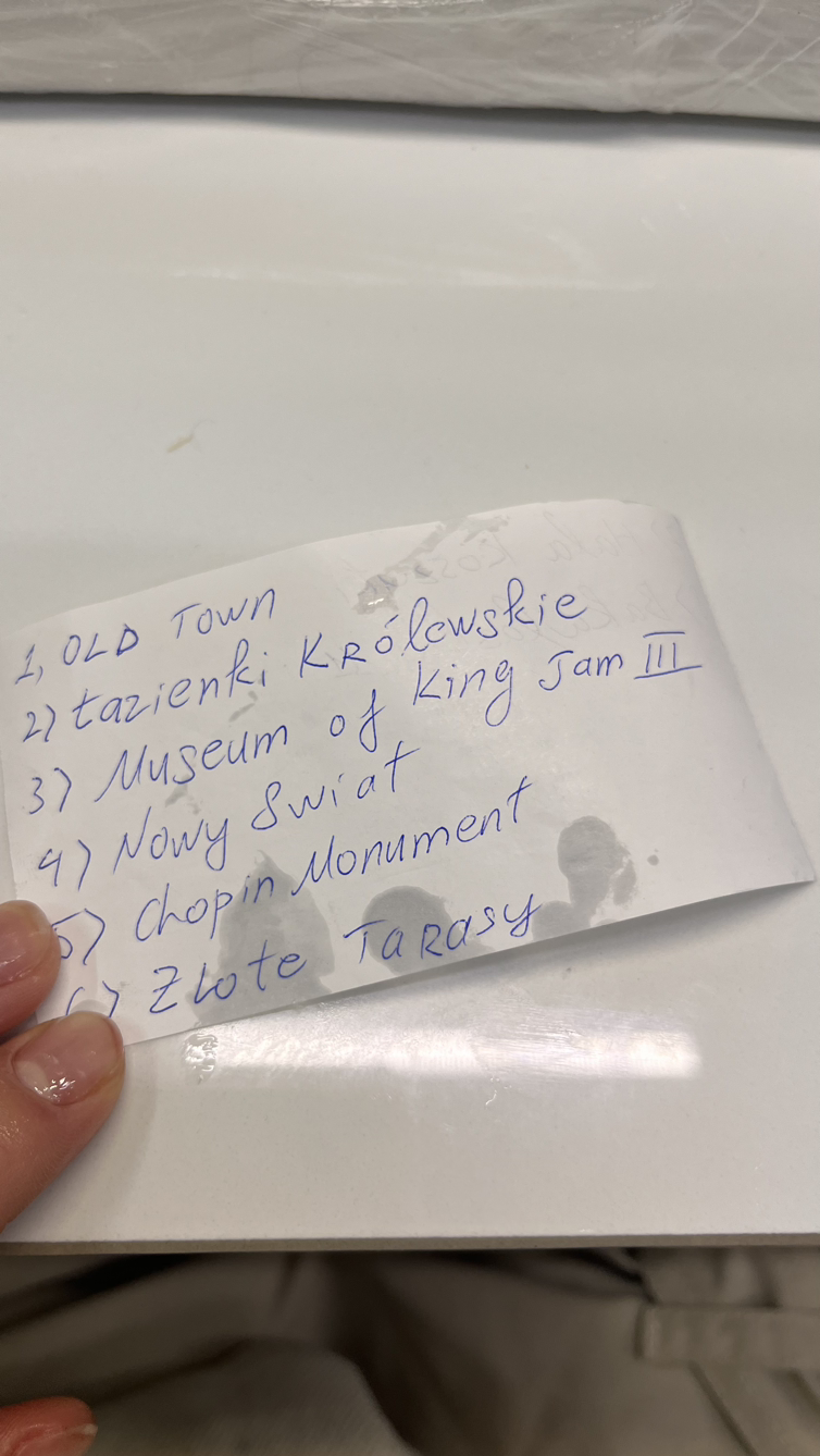내가 여기서 할 것이 뭐가 있냐하는 질문에 손톱을 해주던 언니가 몇 개 알려주긴 했지만 지금으로선 기억이 안 난다. 하지만 손톱을 끝내고 결제를 할 때 사장님이 결제해주시며 어떤 종이를 건내주셨다. 거기엔 바르샤바에서 할 수 있는 관광들이 빼곡히 적혔었다. 옆에서 농담 따먹기하며 놀고있는 줄로만 알았던 사장님이 사실은 옆에서 이렇게 적고 계셨다니! 이런 사소한 걸로 참 감사했다.