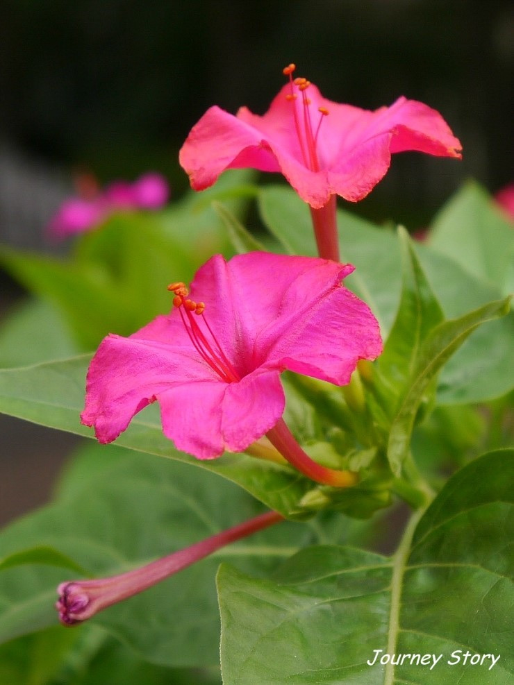 해가 중천에 떠있는데 고개 숙이고 있는 날 보면 스스러운 거라 지레짐작하는 이들이 많아! 하지만 난 아주 정렬적인 분꽃이야! 게으름뱅이라서 해 질 녘에 바빠진다고 생각하면 오산이야. 낮잠 자는 호랑이에게 게으름뱅이라고 말할 수 있어? 해가 기울면 내가 어찌 변하는지 들려줄까? 내 고향 잉카제국은 태양신을 숭배했는데 태양 힘이 가장 약한 날에 풍년을 소망하며 인티라이미 축제를 열어왔어, 정월대보름 지신밟기처럼 발로 땅을 굴러 땅을 깨우고 태양이 도는 방향으로 행진을 해. 땅별 반대편 남미와 달리 여기선 여름이라서 태양이 가장 약한 밤에 축제를 열어. 노랑, 빨강, 보라가 어우러진 화려한 꽃을 피워 고향의 향수를 밤새 즐겼으니 당연히 낮에는 꽃을 접고 쉬어야지.