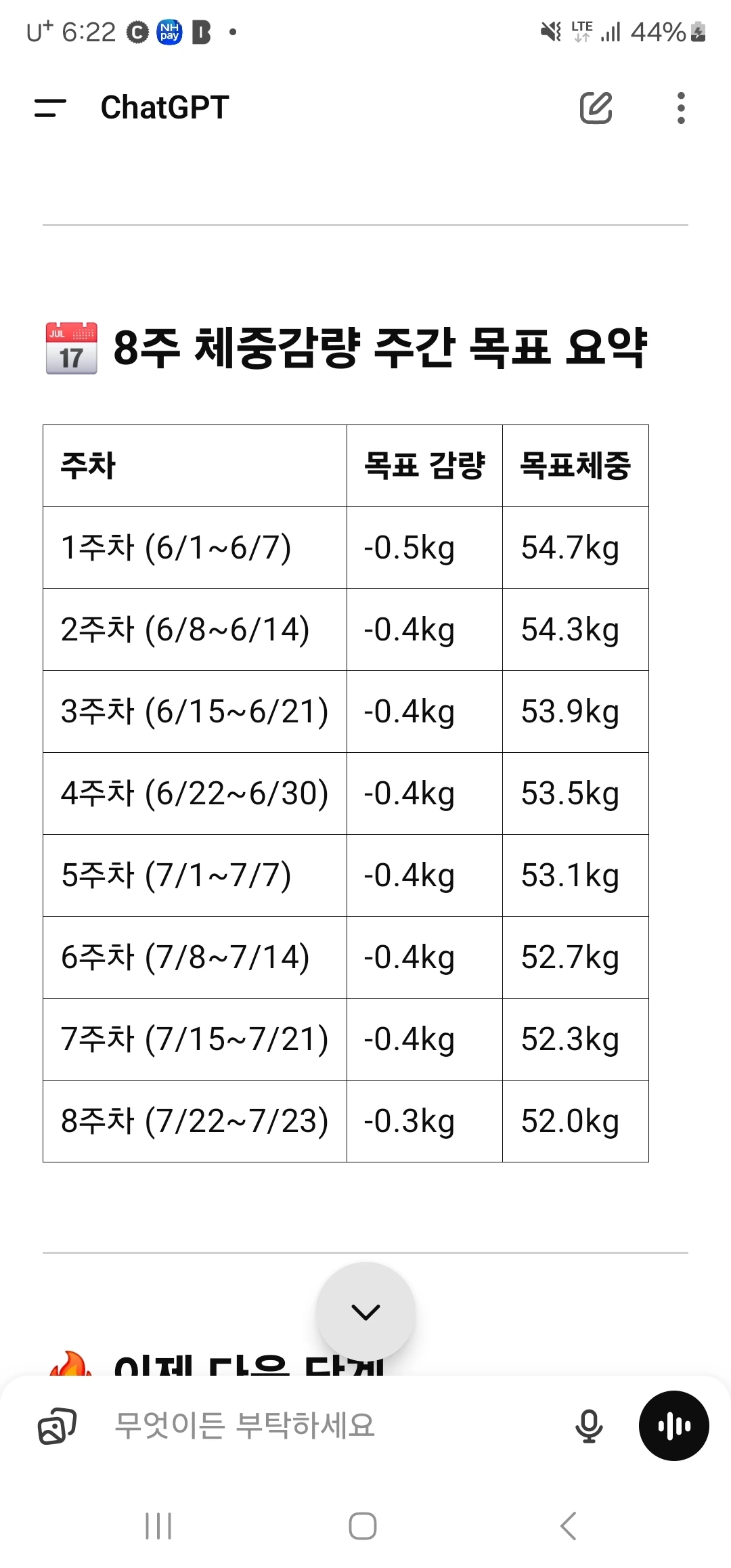 이번 주 토요일까지 감량 목표가 54.7인데 오늘 55.0이었다. 어제는 54.9.