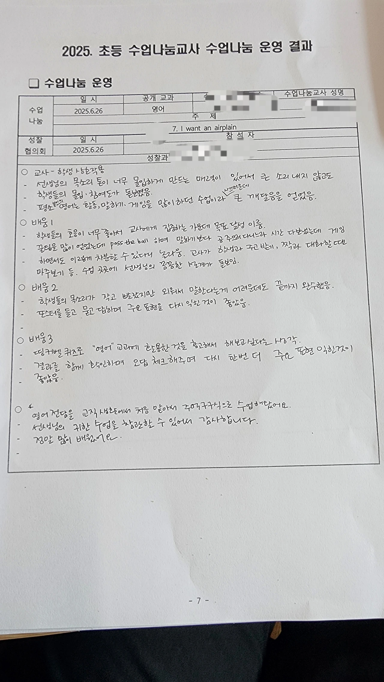 참관 교사가 피드백을 주고 갔다