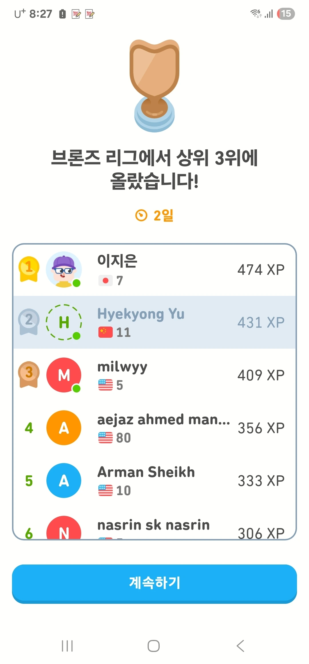 동일 등급 학습자들 가운데 2등을 했다
