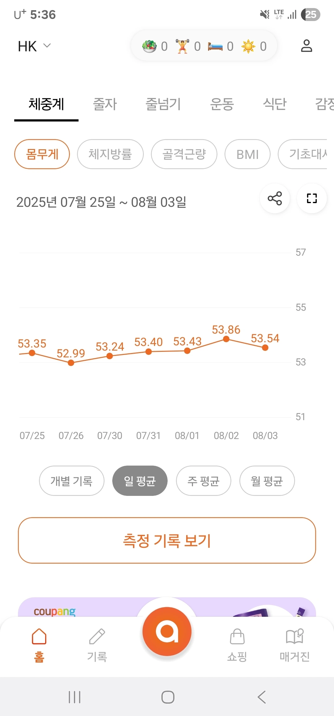 체중은 어제 올랐다가 다시 조금은 내려왔다