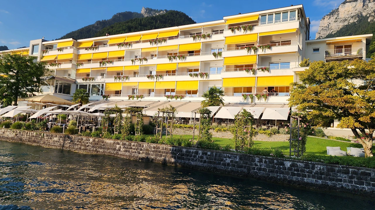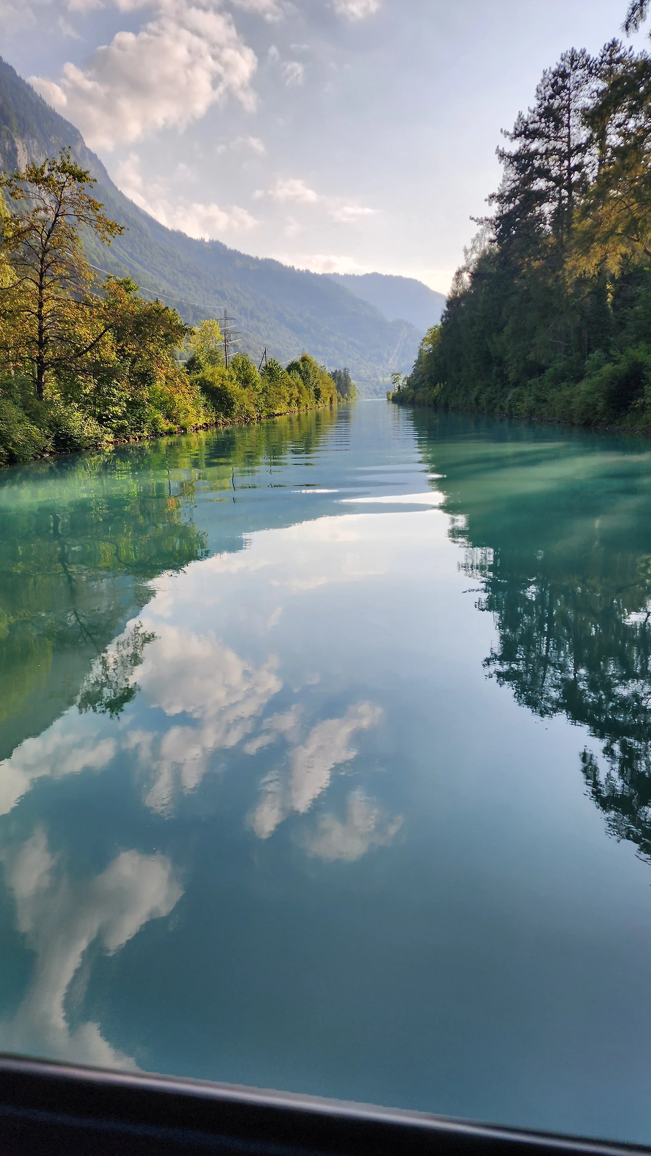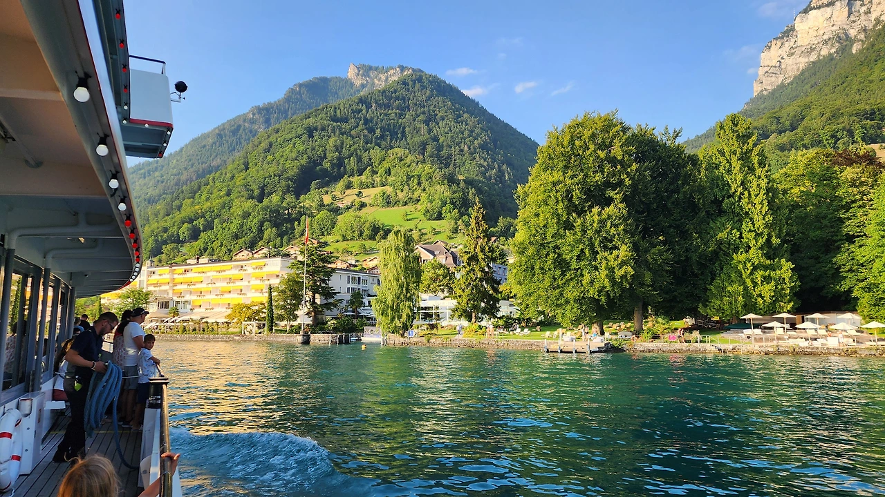 유람선에서 본 turquoise 색의 석회질을 품은 인터라켄 강가는 비현실적으로 아름다웠다
