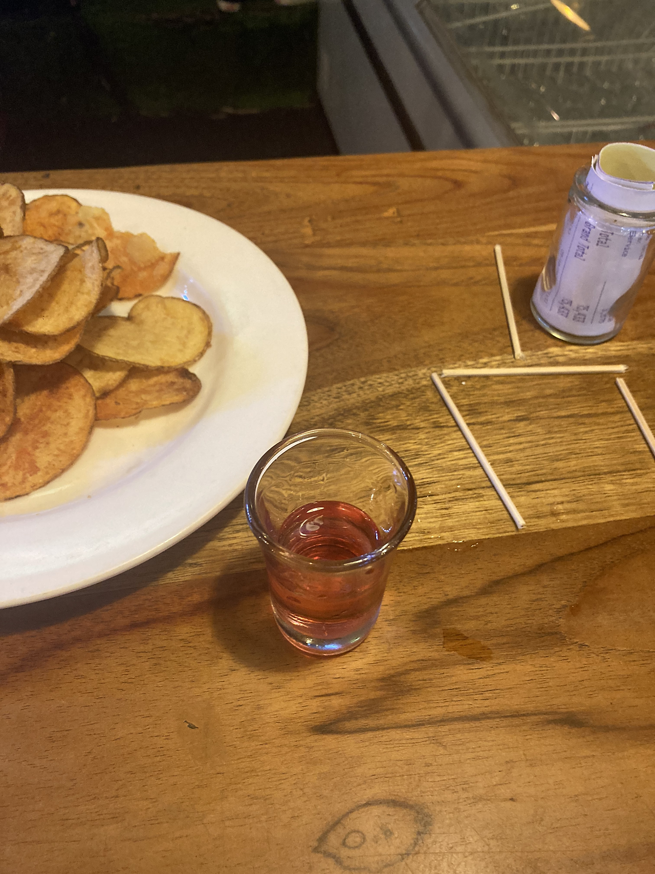 바 자리에 앉았는데 바텐더랑 말하고 놀았다. 감자칩을 서비스라고 주더니. 저 나무 막대로 문제도 내주고 풀면 술 주겠다고 했는데 사실 힌트를 줘서 거저먹었다.