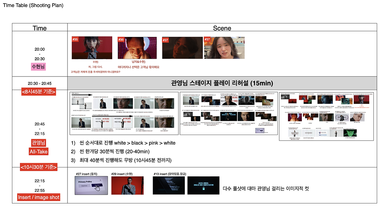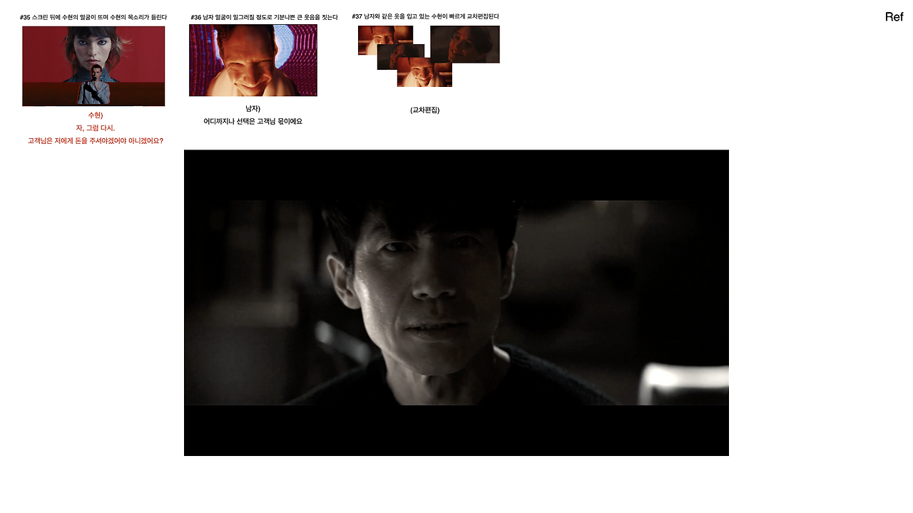 배우님들께 요청드렸던 연기 감정톤 레퍼런스 [올드보이 이우진]과 같은 친근한 듯 공손한 듯하지만 깔보고 협박하는 톤과 마지막 절정씬에선 [SKzic 신하균]의 감정이 사그러지면 무표정이 되어가는 데크레센도로 레퍼런스로 설명드렸다. 역시나 선공유를 하길 잘했다.
