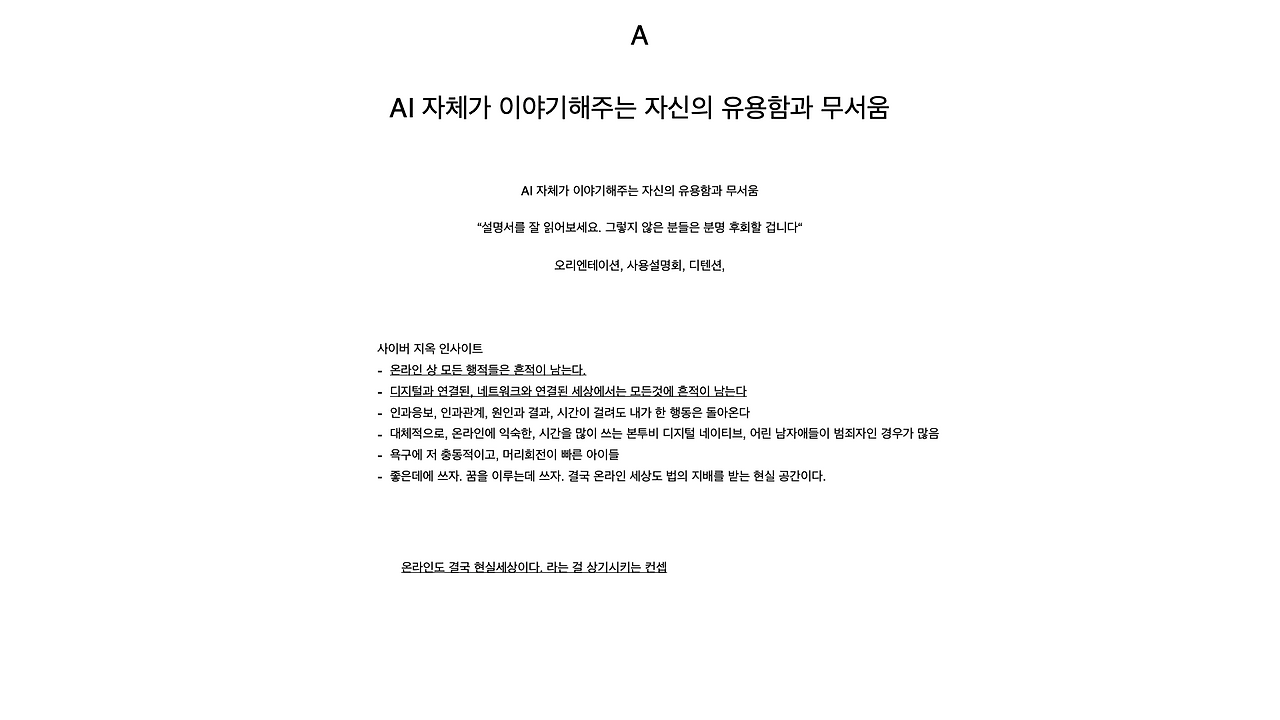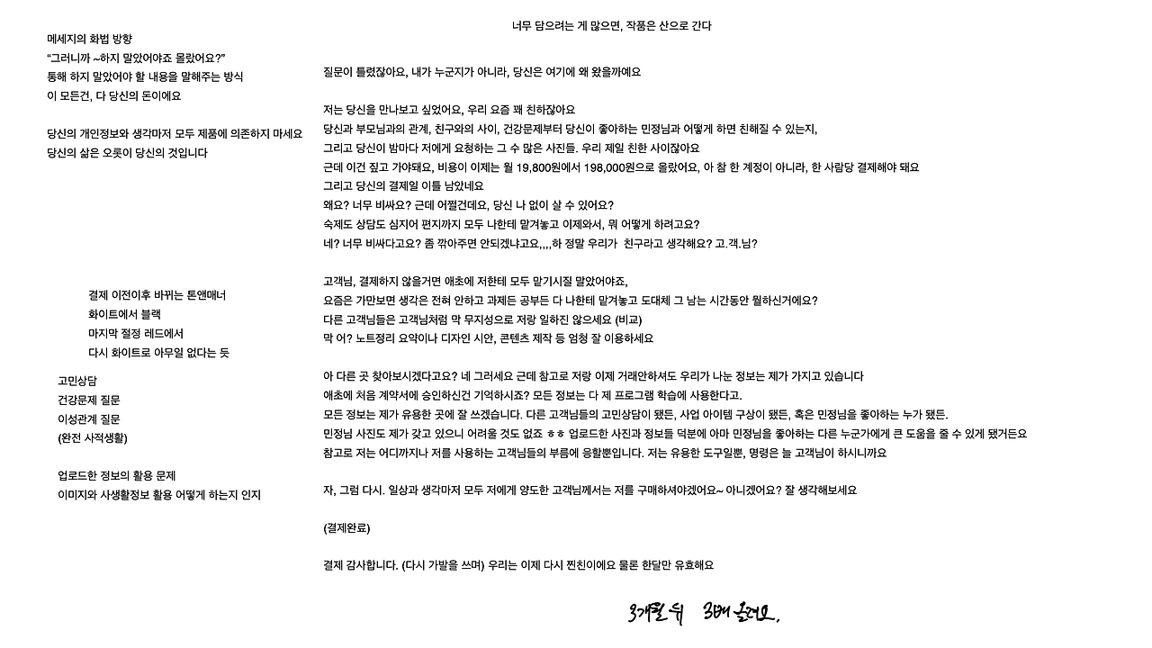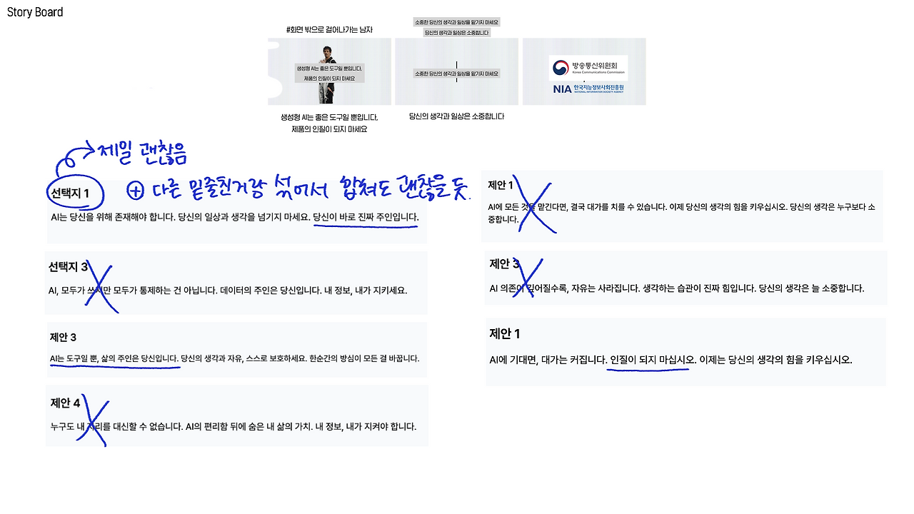 참 웃긴일이다. 생성형AI 의존에 대한 경고 필름을 만들면서 역으로 카피에 대한 고민을 지피티와 함께 고민했다는 일이 말이다. 메인 카피는 정해진 상태에서, 앞 컷에서 이를 뒷받침해줄 서브카피가 똑 부러지지 않았고 이를 지피티에게 여러 방향으로 제안을 받았다. 근데 결과가 꽤나 좋았다. 어렴풋한 머릿속 생각들을 지피티가 구체적인 방향을 나누어 보여주니 선택하기가 매우 쉬워진 것이다. 주관식에서 객관식으로 문제가 변환되었고 훨씬 문제해결이 수월해졌다.