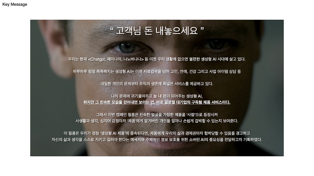 착하고 친숙한 나만의 생성형 AI의 이미지를 전복시키는 것이 이번 캠페인 안에서 제일 중요하다고 생각했다. 영(young)해보이려 온갖 노력을 한 50-60대 중년남성을 등장시킨 뒤 10-20대 주인공의 내밀한 고민을 이야기하고 있었다는 이미지 충격을 주고 싶었다. 친숙한 말투에 같은 나이대일 것이란 이미지를 전복시켜 대화가 가능한 생성형 AI의 본질은 글로벌 대기업이 오랜기간 막대한 자본을 투입해 제작한 친구인척 친근한 말투를 학습한 제품 서비스라는 걸 이미지화시켰다. 그리곤 제품이 1020 그들의 생활에 깊숙히 들어와 있음을 자각하도록 스토리 흐름을 설계했다.