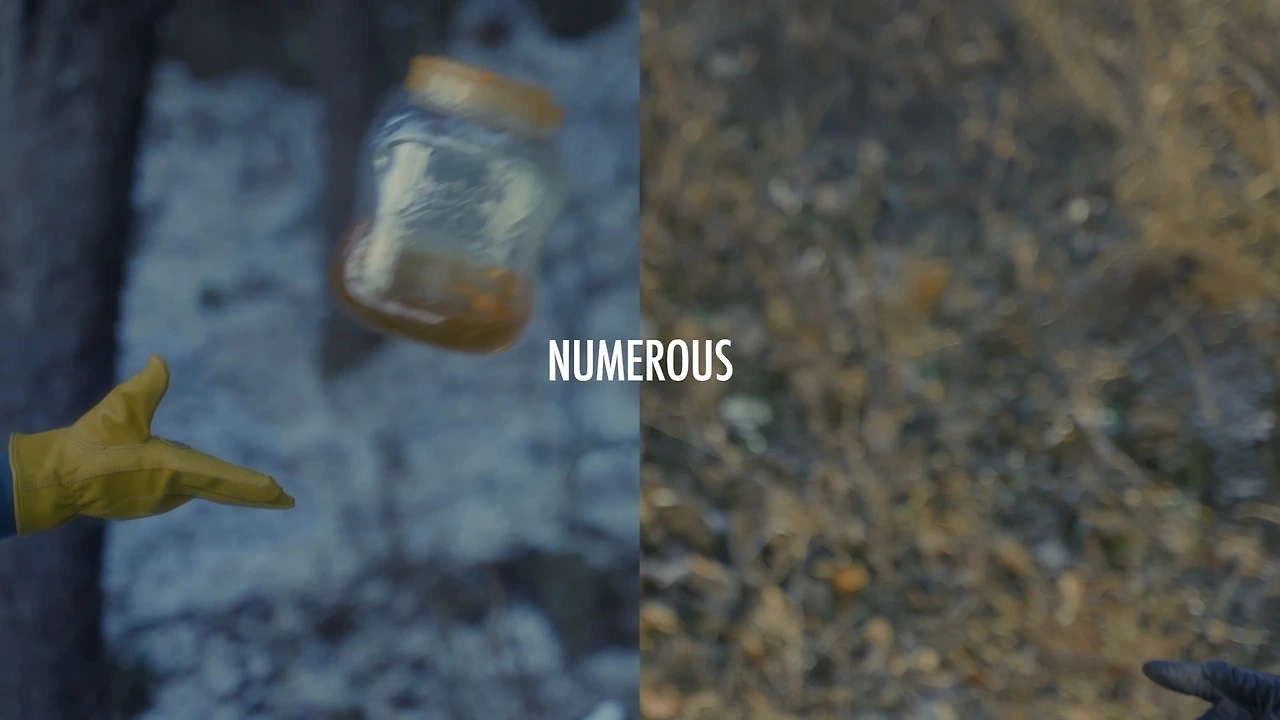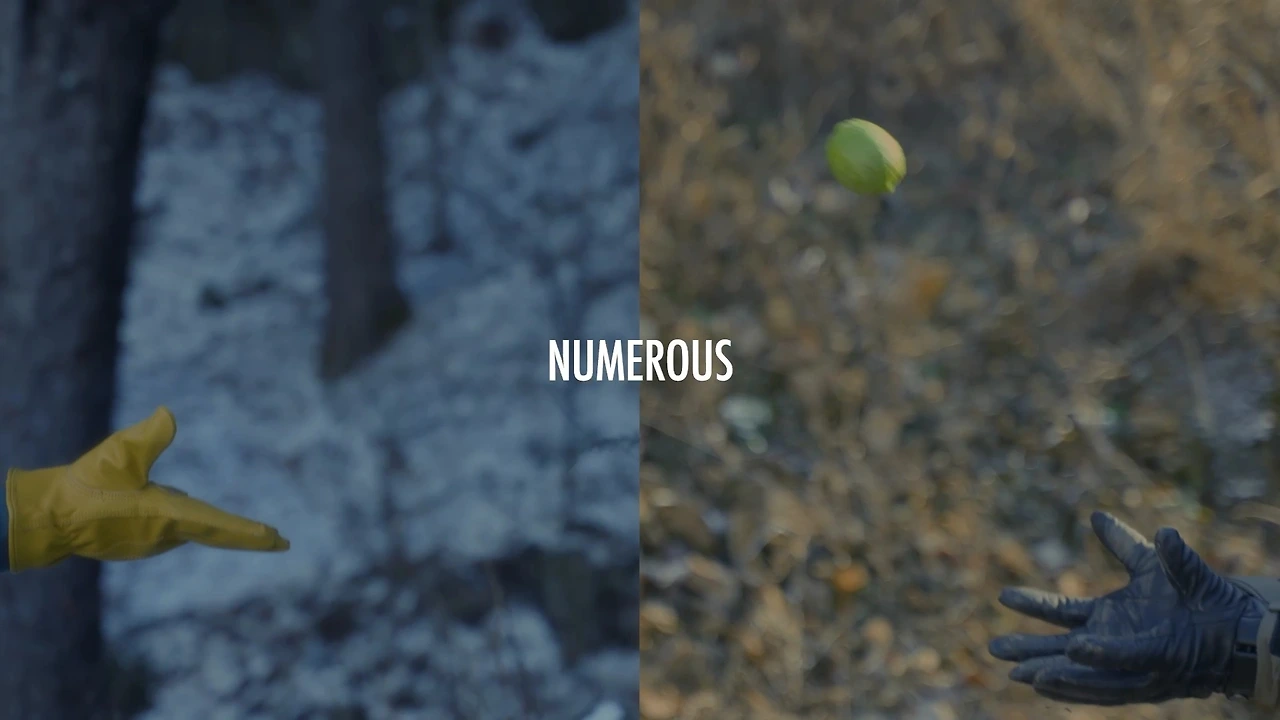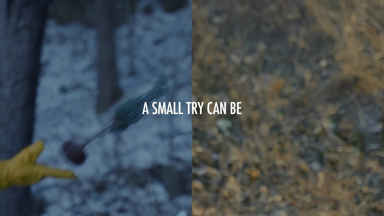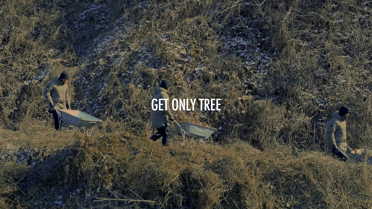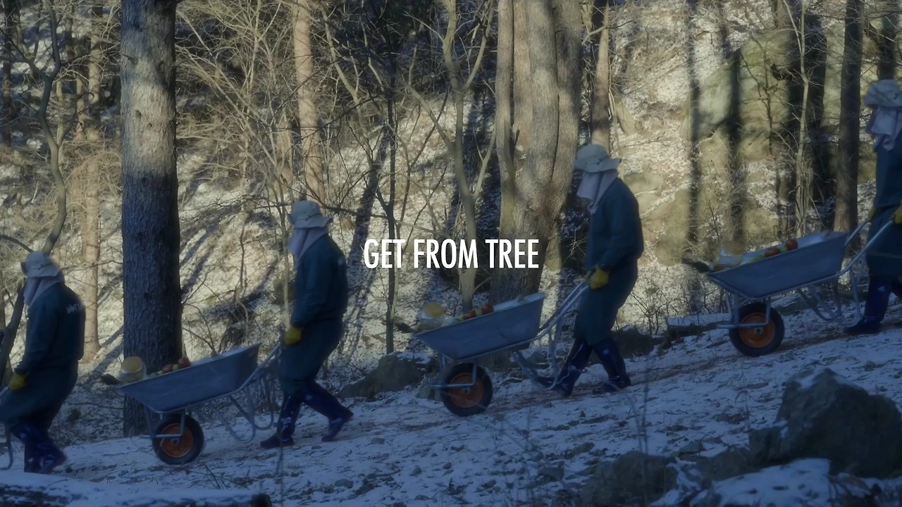 5) 줌아웃되는 드론샷, 전 컷과 달리 푸른 나무와 함께 남자 주변으로 여럿 생기 넘치는 과일과 작물 등이 보인다. "아포코, 부유하고 건강한 지구를 위한 친구"