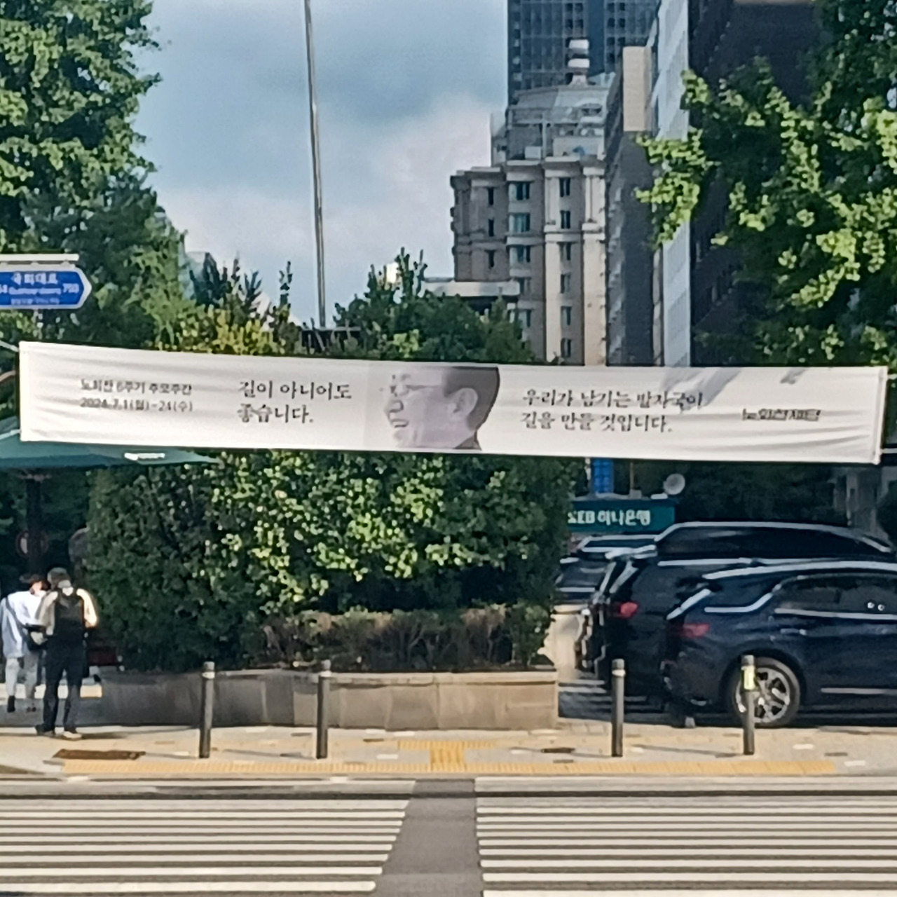 국회도서관이 국회 옆에 있다보니 그곳을 자주 지난다. 으레 시위하는 사람이나 주장을 담은 푯말같은 것들이 있고, 경찰이 늘 지키고 있다. 각 정당의 현수막도 보이는데, 얼마전 노회찬 의원 6주기 추모 주간임을 알리는 현수막을 보았다.