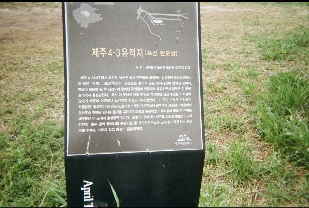 <한모살>은 한(큰), 모살 (모래), 즉 넓은 모래사장이라는 뜻이다. 이곳은 표선해수욕장 백사장 일대로, 4.3 당시 표선면, 남원면 일대 주민 200여 명이 희생된 일상적인 총살장이었다고 한다. 어? 석 달 전 내가 인상적으로 보았던 표지판이 없어졌다. <재주 4.3 유적지 (표선 한모살) >이라 적힌 작은 표지판이었는데 어디로 갔지? 믿을 수 없어하는 일행들에게 석 달 전, 내가 찍었던 사진을 보여 주었다. 바로 앞에 자리한 체육관 주차장 공사를 하며 표지판을 없애 버린 것이다.