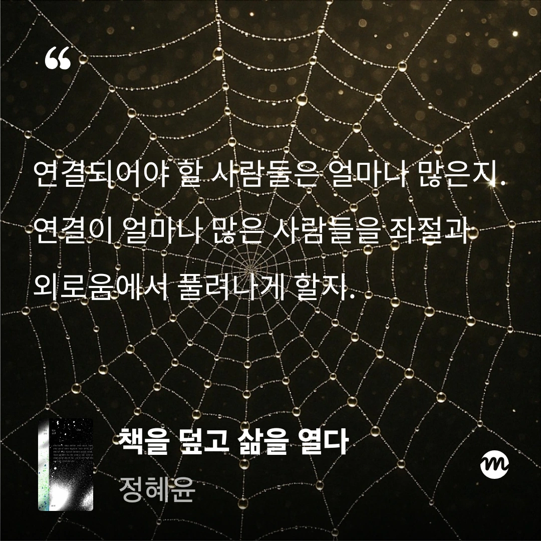 “맥락과 연결” 요즘 내 머리를 흔드는 키워드들이다. 옳고 그름이라는 이분법에서 벗어나 어떤 맥락에 처해 있는지 상황을 살피는 깊이 있는 시선, 어떤 연결이 올바른가, 연결이 끊겨 소외된 자들에 대한 촘촘한 관계망이 궁금하다. 인간과 지구타자들 간의 얽힘과 상호 관계성, 서로 돌봄에 대한 나의 인식이 이렇게 거미로 이어지고 있는 것이다.