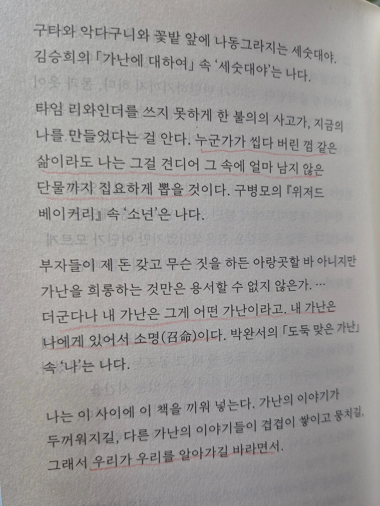 요즘 ‘가난 밈 meme’이 유행이라는 뉴스를 보았다. 점심으로 라면과 김밥을 먹으며 ‘지긋지긋한 가난’을 말하고 있지만, 그 옆에 다소곳이 놓인 고가의 시계와 슈퍼카 열쇠는 그 사진이 자신의 부를 과시하는 것임을 확연히 드러낸다. 그 사진 밑으로는 ‘저도 그 가난, 물려받고 싶네요.’라는 댓글들이 올라와 있었다. 순간 나는 모멸감을 느꼈다. 가난은 그렇게 얘기되어서는 안 되는 것이다. 그들은 웃자고 하는 농담이라고 하지만, 가난이 현재진행형인 이들에게는 조롱이고 돌멩이고 아픔이다. 가난은 매화 언니의 고무신 속에서 기형적으로 자라 버린 발처럼 구체이고 실질이며 실체이다..