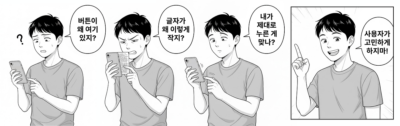 사람은 원래 단순하고 본능적으로 행동합니다. 눈이 닿는 대로, 손이 가는 대로, 익숙한 패턴을 따라 움직이죠. 그런데 서비스를 이용하다가 “왜?”라는 생각이 드는 순간, 그 사람의 몰입은 끊기고 불편함과 불신이 싹트기 시작합니다.