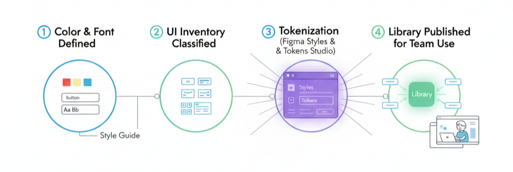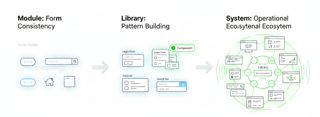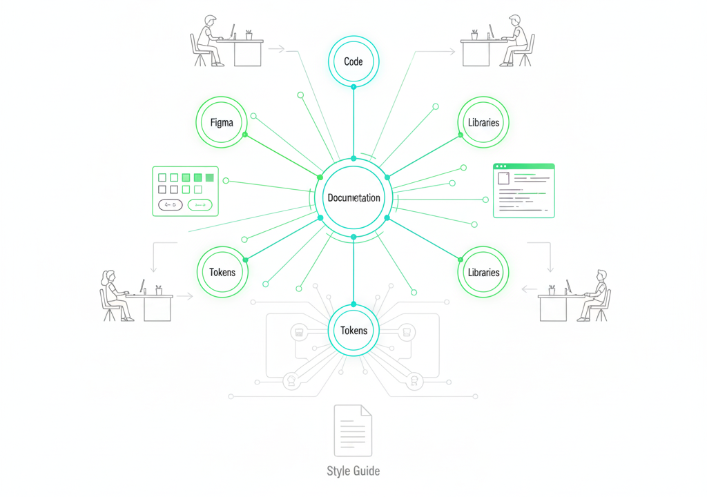 라이브러리가 연결되어 운영 가능한 생태계로 확장됩니다. 디자인 토큰, 컴포넌트, 문서, 코드가 연결된 상태.