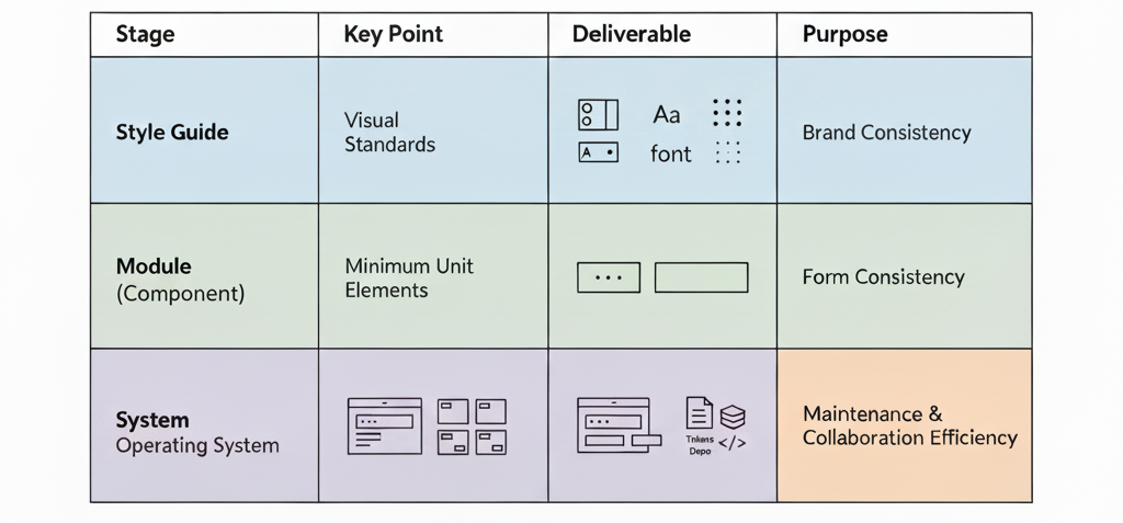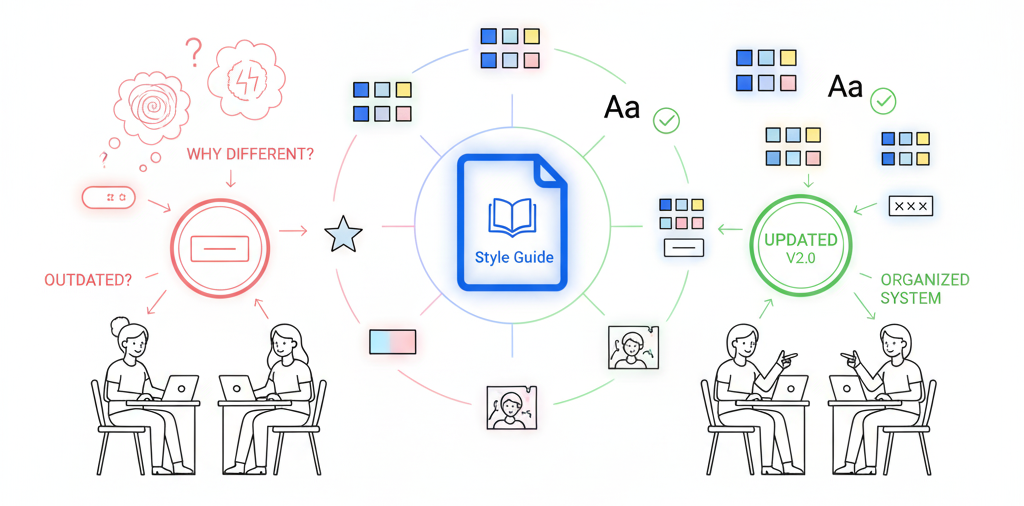 UX/UI 실무에서 가장 자주 들리는 질문이 있습니다. “스타일가이드랑 디자인시스템은 뭐가 다른가요?” 둘 다 ‘디자인 기준을 정리하는 문서’처럼 들리지만, 사실 이 둘의 관계는 정리 vs 운영의 차이에 가깝습니다. 스타일가이드는 기준서, 디자인시스템은 운영체계입니다.