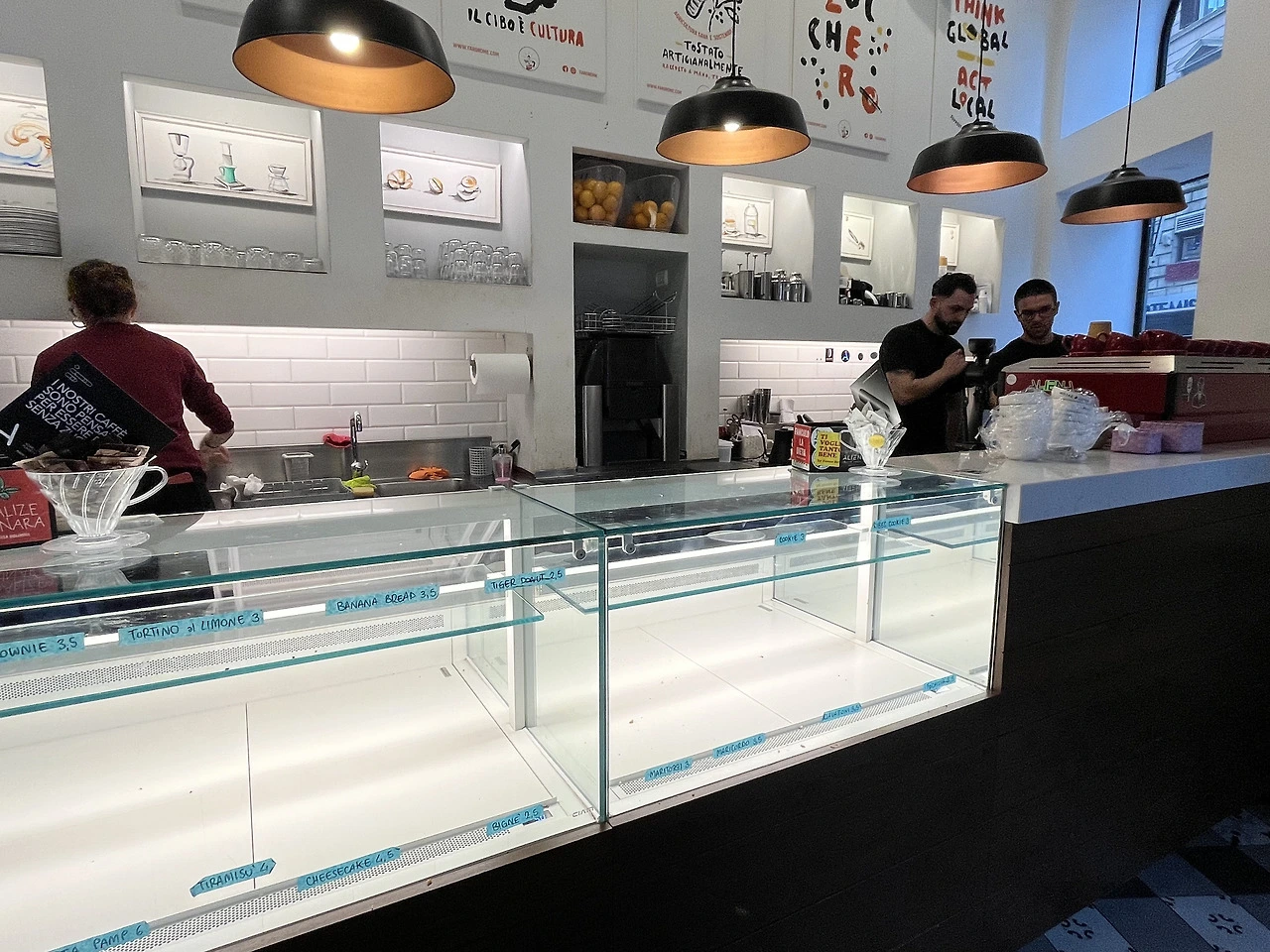 이탈리아에서 검색해본 요즘의 동네 카페들은 점점 ‘바’의 형태에서 멀어지고 있었다. 실제로 Faro의 내부는 우리가 흔히 떠올리는 이탈리아의 ‘바’와는 전혀 달랐다. 포진된 좌석, 쇼케이스, 커피머신 너머로 분주한 직원들. 이곳은 명백히, 머물 수 있는 공간이었다. 바 테이블에 서서 빠르게 커피를 마시는 전통 대신, 한국이나 호주처럼 테이블에 앉아 음료를 즐기고, 아이스 메뉴를 적극적으로 홍보하는 카페들이 늘어나고 있었다.
