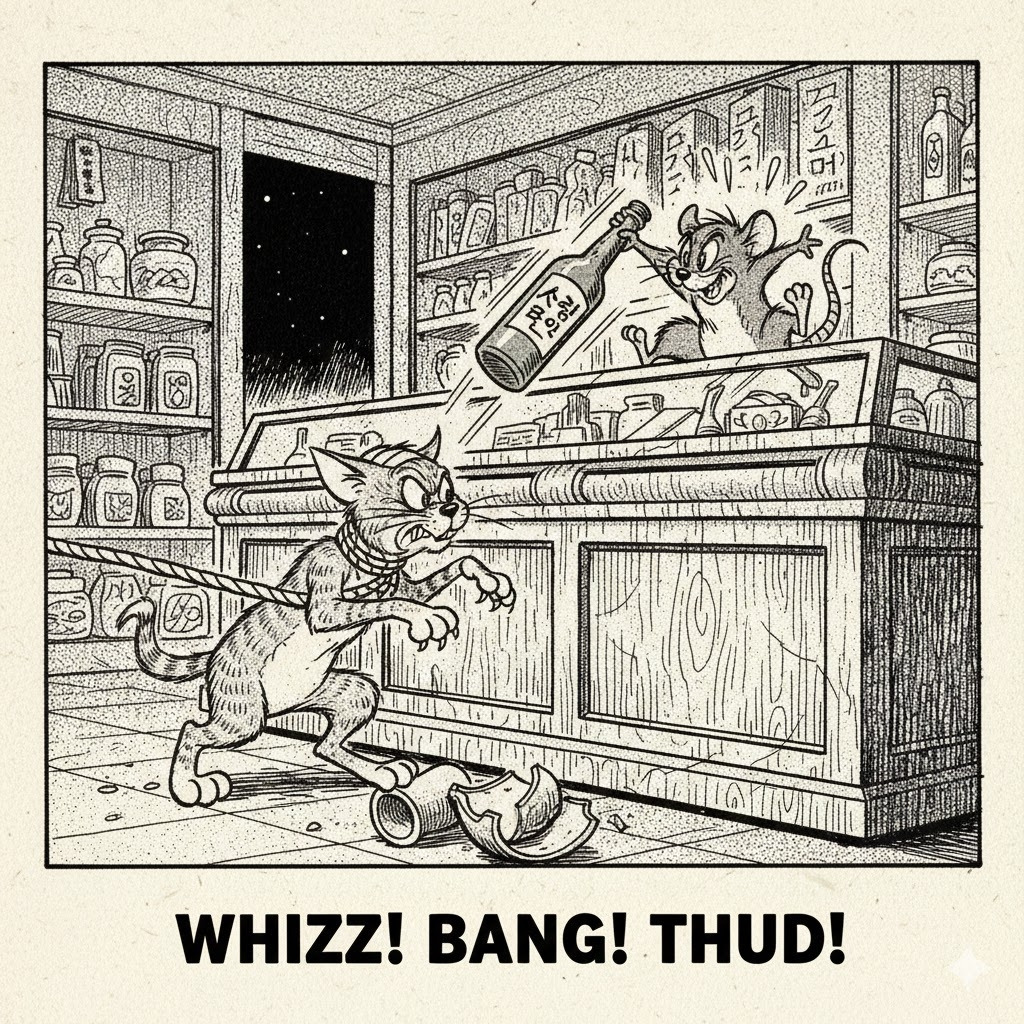 그래서 묶어놓고 키웠더니, 이번에는 고양이가 자유로운 쥐들에게 농락을 당했다. 고양이가 묶인 채 진열대 위를 지나가는 쥐를 보며 약이 올라 들썩이다가, 쥐가 건드린 소주병이 떨어져 머리에 맞고 시름시름 앓다 죽은 일화도 있다.