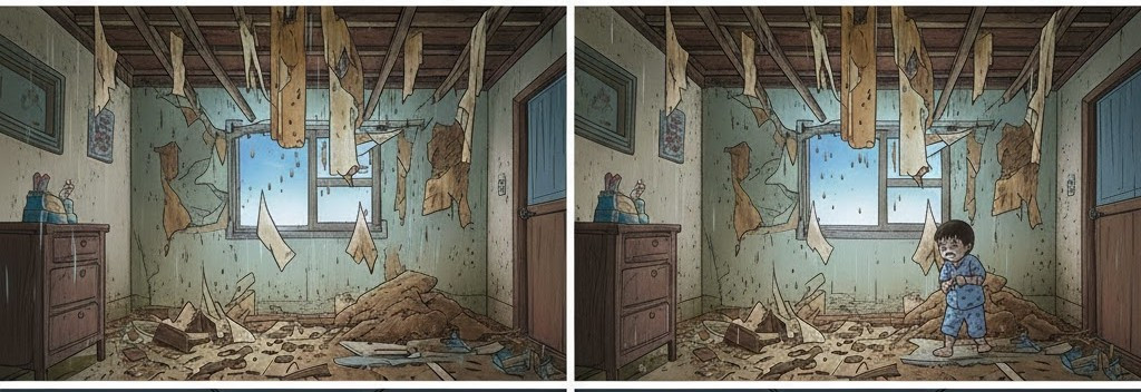 그러던 어느 날, 나는 하늘이 무너지는 경험을 했다. 비가 새는 셋방이었지만 그곳이 유일하게 안전한 줄 알았는데, 비가 오던 날 천장에서 진득한 흙 같은 것이 떨어졌다. "엄니, 하늘이 무너져요"라고 외치기도 전에 정말 천장이 주저앉았다.