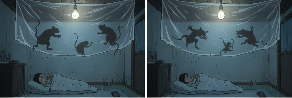 홍수가 심해 인부가 부족했던 탓에 매형의 도움을 받아 도배지 대신 비닐을 압정으로 고정했다. 비는 피했지만, 그때부터 청각을 자극하던 쥐의 소리가 시각으로 변하기 시작했다. 비닐 위로 쥐 가족들이 왜 그리 뛰는지, 뛰다가 미끄러지는 실루엣이 생생하게 보였다.