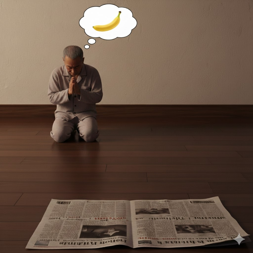 무릎 끓고 기도하는데 사람 머리에 말표 만들어서 말표안에 바나나 한개 그려줄 수 있어?