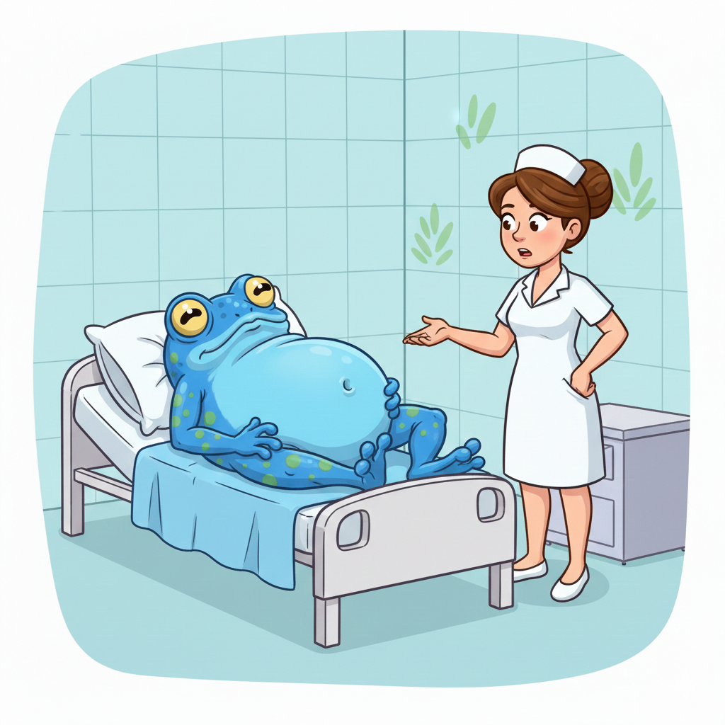 개구리가 너무 편한 표정이다, 개구리가 병원 베드에 머리가 닿아서 옆으로 눕고 뒤에 하얀 가운 입은 간호사가 서있는거