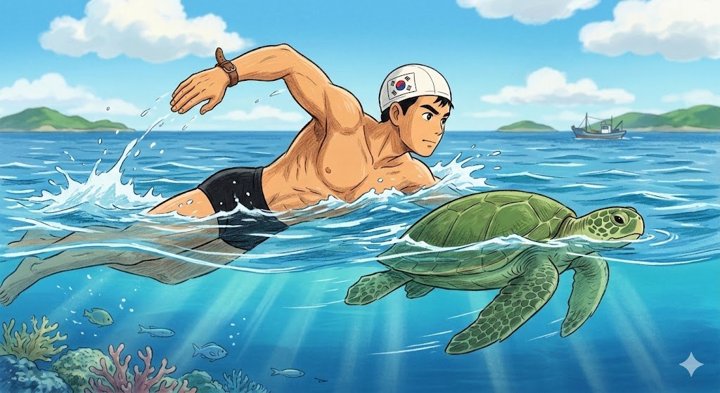 "아시아 물개 조오련하고 바다거북이 하고 헤엄치기 시합하면 누가 이길 것 같노?"