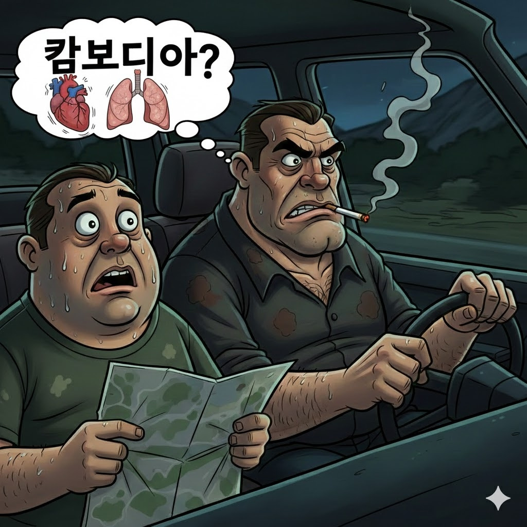 불빛 하나 없는 산길. 나는 어디로 가는가? 더욱더 무서운 것은 주변에 차가 단 한 대도 보이지 않는다는 것이다. 정말 담배 냄새 때문에 숨이 막힌다. 나는 아저씨 눈치를 보며 살금살금 숨을 쉬기 위해 창문을 조금씩 연다. 왜 그가 트는 음악은 사람을 더 소름 돋게 하는지. 미터기는 40만 동을 넘어도 산길이다. 50만 동을 넘어도 산길인 것 같다. 자꾸자꾸 캄보디아가 생각난다. 60만 동도 넘었다. 호텔이 아니다. 나트랑 공항도 아니고 이상한 캄란 공항에 와서…. 거기서 나는 ‘설마’ 하는 마음이 ‘혹시’로 바뀌었다.