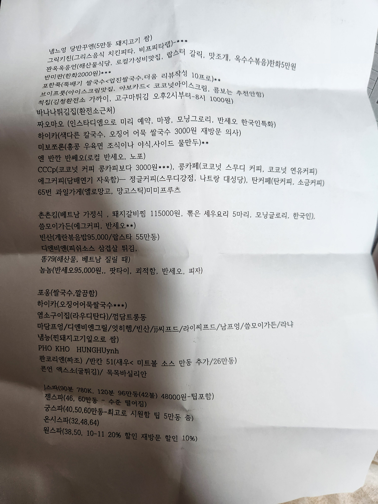 이번 나트랑 여행도 준비는 철저히 했다. 유튜브 나트랑 맛집은 다 검색했다. 그리고 하나하나 받아 적었다. 그것을 한글로 쳐서 프린트로 뽑았다. 나의 사랑하는 며늘님께서, 아니 아드님의 부인께서 나트랑 할인 쿠폰과 무료 쿠폰을 하사하셨다.