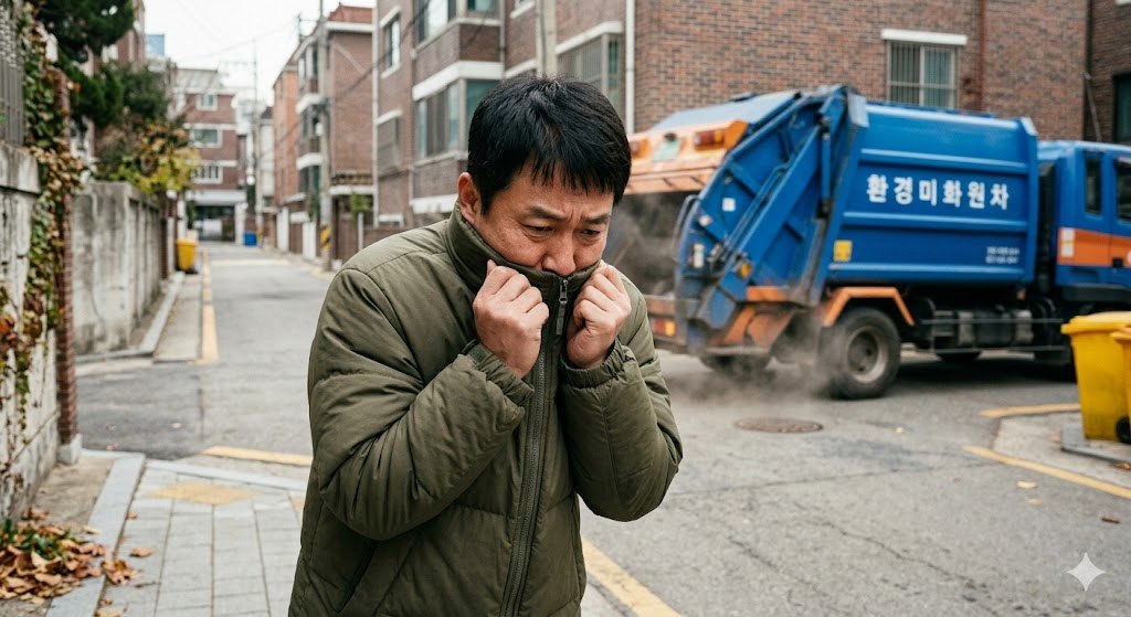 그 순간 쓰레기차가 뒤늦게 나의 앞을 지나간다.