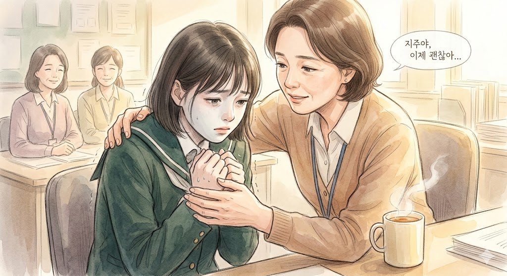 여교사의 따뜻한 말에도 여고생은 무엇인가에 놀라서 떨고만 있다.