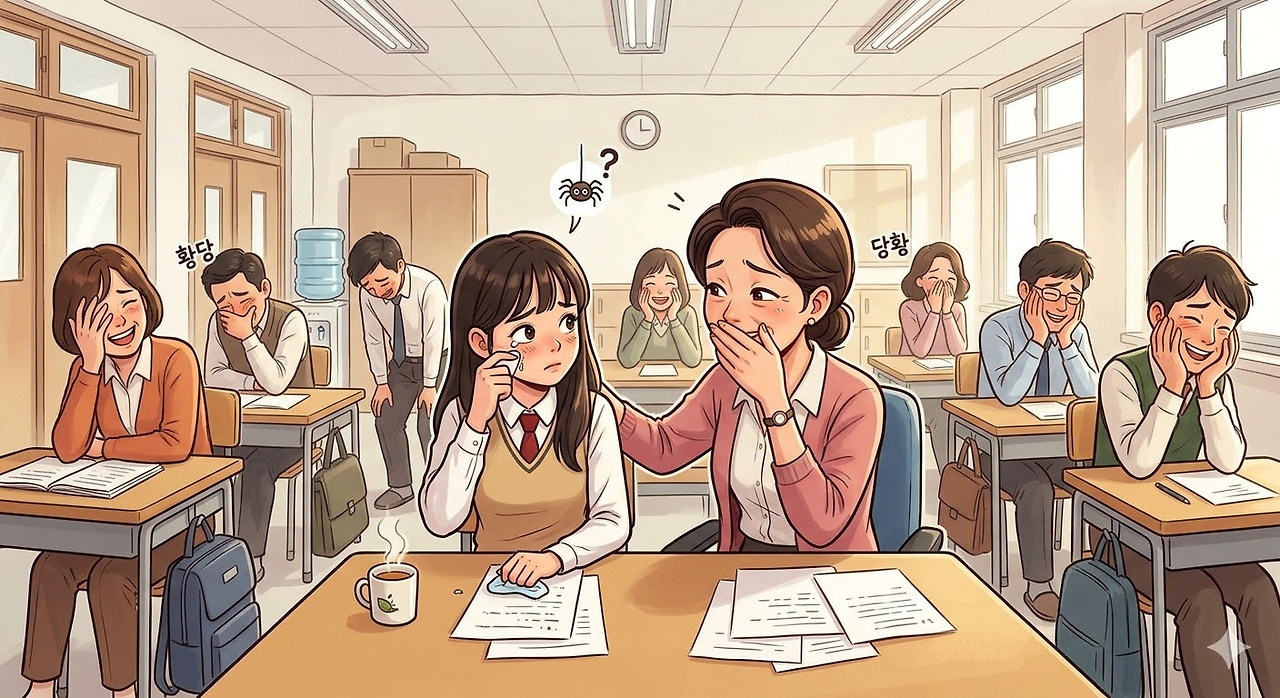 교무실이 빵 터졌다. 아니, 웃음을 참았다.